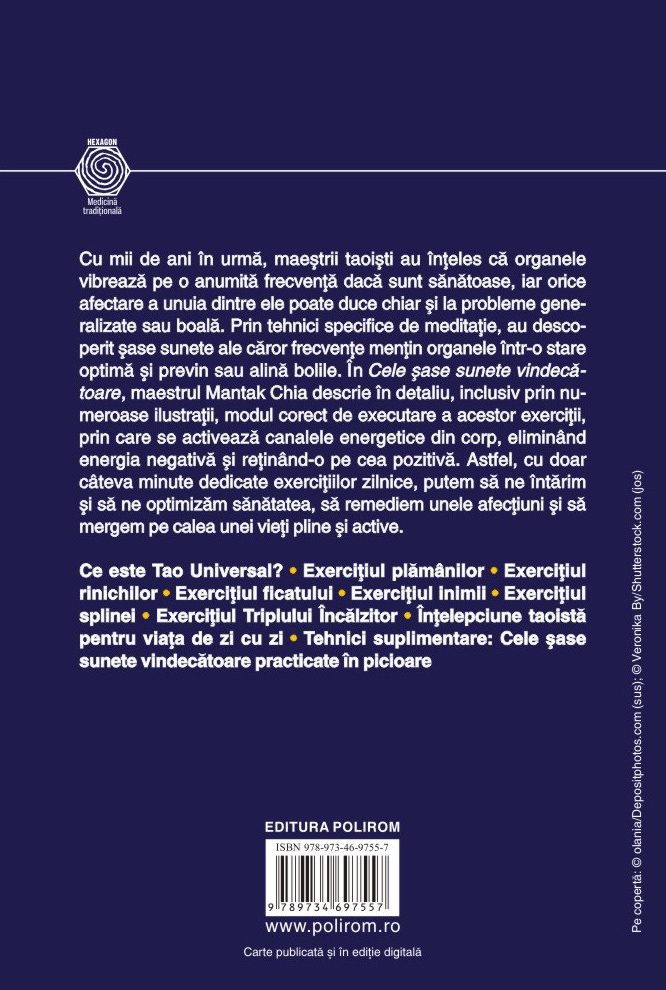 Cu mii de ani în urmă, maeștrii taoiști au înțeles că organele vibrează pe o anumită frecvență dacă sunt sănătoase, iar orice afectare a unuia dintre ele poate duce chiar și la probleme generalizate sau boală. Prin tehnici specifice de meditație, au descoperit șase sunete ale căror frecvențe mențin organele într-o stare optimă și previn sau alină bolile. În Cele șase sunete vindecătoare, maestrul Mantak Chia descrie în detaliu, inclusiv prin numeroase ilustrații, modul corect de executare a acestor exerciții, prin care se activează canalele energetice din corp, eliminând energia negativă și reținând-o pe cea pozitivă. Astfel, cu doar câteva minute dedicate exercițiilor zilnice, putem să ne întărim și să ne optimizăm sănătatea, să remediem unele afecțiuni și să mergem pe calea unei vieți pline și active.