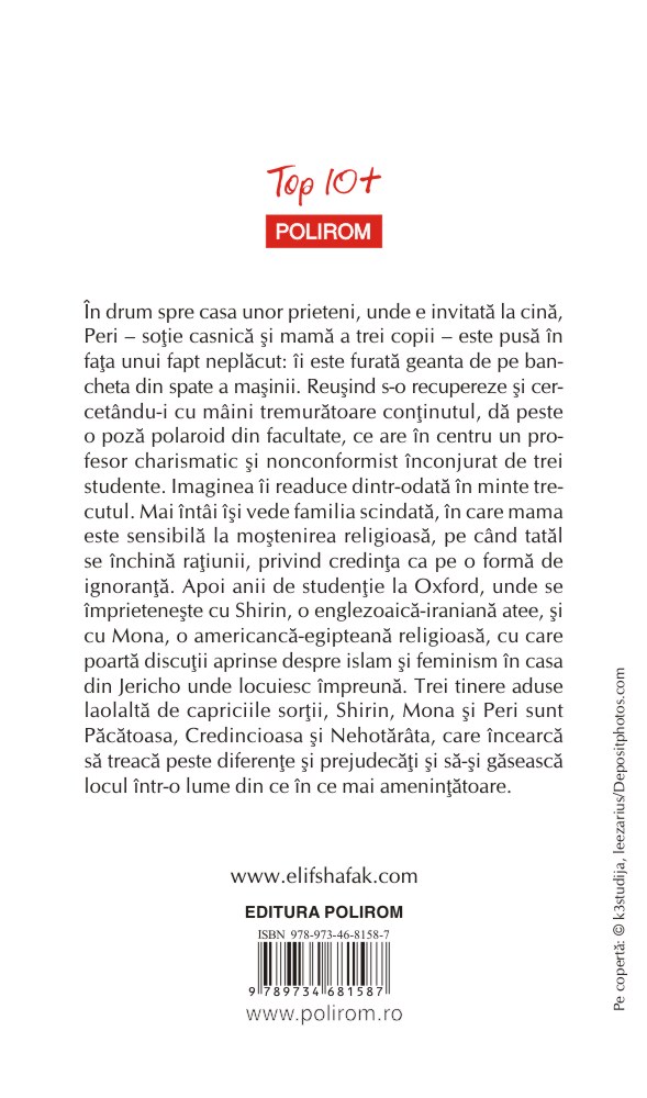 In drum spre casa unor prieteni, unde e invitată la cină, Peri – soţie casnică şi mamă a trei copii – este pusă în faţa unui fapt neplăcut: îi este furată geanta de pe bancheta din spate a maşinii. Reuşind s-o recupereze şi cercetîndu-i cu mîini tremurătoare conţinutul, dă peste o poză polaroid din anii de studenţie la Oxford, ce are în centru un profesor charismatic şi nonconformist înconjurat de trei studente. Imaginea îi readuce dintr-odată în minte trecutul. Mai întîi îşi vede familia scindată, în care mama este sensibilă la moştenirea religioasă, pe cînd tatăl se închină raţiunii, privind credinţa ca pe o formă de ignoranţă. Apoi anii de studenţie la Oxford, unde se împrieteneşte cu Shirin, o englezoaică-iraniană atee, şi cu Mona, o americancă-egipteană religioasă, cu care poartă discuţii aprinse despre islam şi feminism în casa din Jericho unde locuiesc împreună. Trei tinere aduse împreună de capriciile sorţii, Shirin, Mona şi Peri sînt Păcătoasa, Credincioasa şi Nehotărîta, care încearcă să treacă peste diferenţe şi prejudecăţi şi să-şi găsească locul într-o lume din ce în ce mai ameninţătoare.