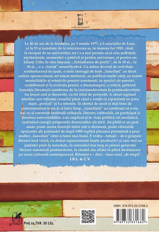 La 40 de ani de la fondarea, pe 3 martie 1977, a Cenaclului de Luni, şi la 33 şi jumătate de la interzicerea sa, în toamna lui 1983, când, la început de an universitar, nu i s-a mai permis să-şi reia şedinţele săptămânale, momentul e potrivit şi pentru aniversare, şi pentru un bilanţ. Cifra în sine impune. „Schimbarea de prefix”, de la 30 şi… la 40 şi…, e o „bornă” semnificativă. Cu atâtea decenii de activitate scriitoricească în spate, o serie întreagă de foşti „lunedişti” au făcut cariere spectaculoase ori măcar meritorii, au publicat multe cărţi, au înnoit mentalităţile şi retoricile poeziei româneşti, în special ale poeziei, contribuind şi la evoluţia prozei, a dramaturgiei, a criticii, grăbind tranziţia literaturii autohtone de la (neo)modernitate la postmodernitate. Au trecut anii şi deceniile, cu tot felul de peripeţii. A căzut regimul totalitar care tolerase cenaclul până când a simţit că reprezintă un prea mare „pericol” şi l-a interzis. În sfertul de secol şi mai bine de postcomunism scurs şi el între timp, „lunediştii” au continuat să scrie, dar au şi construit instituţii culturale, literare, editoriale, au participat la înnoirea universităţilor, s-au implicat şi în viaţa politică ori mediatică, susţinând energic progresele democratice ale ţării. Au plătit şi un preţ amar: poate uzura tinereţii trăite sub o dictatură, poate eforturile epuizante ale perioadei de după 1989 explică plecarea prematură a prea multor „lunedişti” către o lume mai bună. E vorba – totuşi! – de o grupare literară încă vitală, cu destui reprezentanţi foarte productivi şi care mai au puţintel până la senectute, în orizontul mai larg al primei generaţii literare româneşti postmoderne, la rândul său aflată în plină desfăşurare pe scena culturală contemporană. Bilanţul e – deci – doar unul „de etapă”. I.B.L. & C.V.