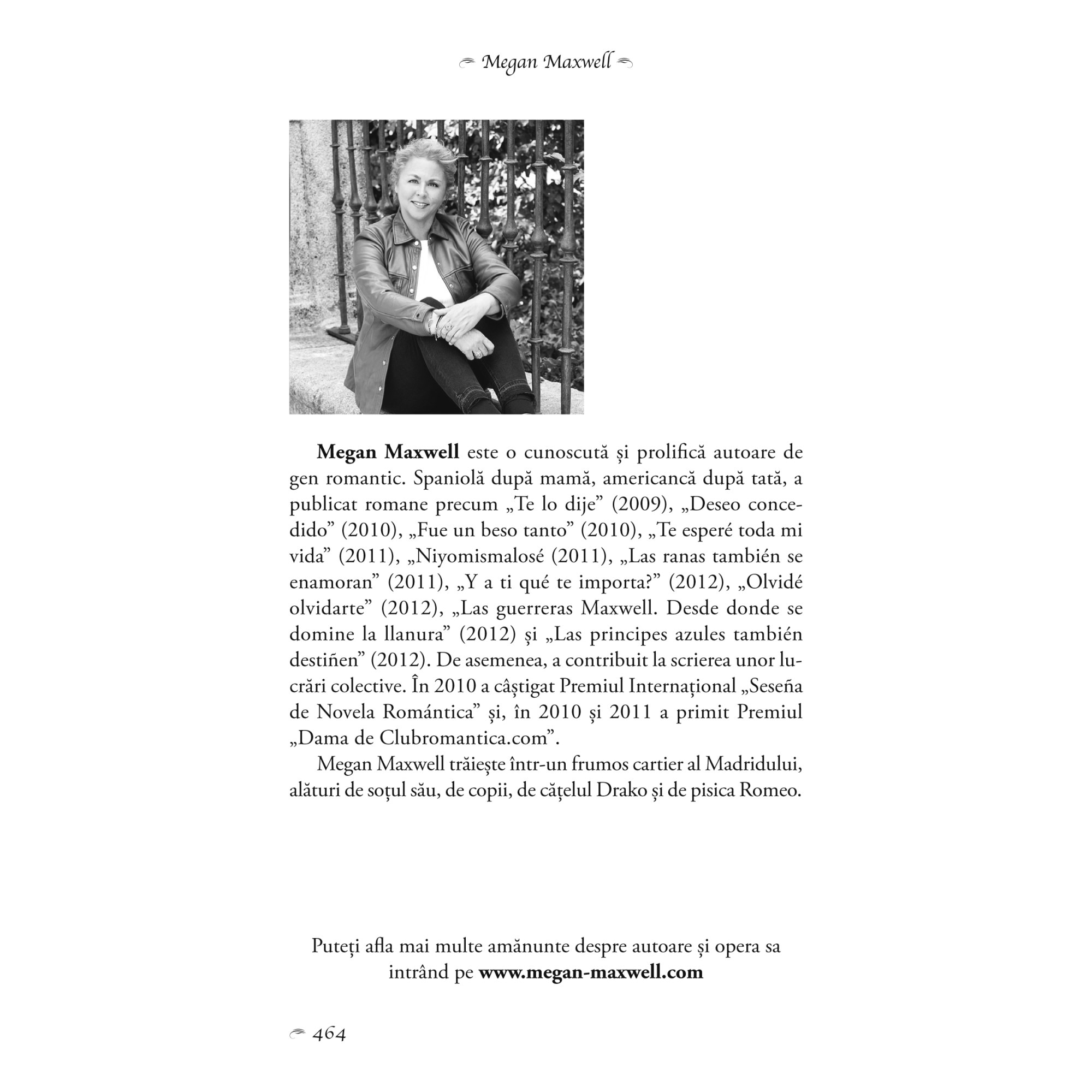 Născută in Germania, Megan Maxwell este o cunoscută scriitoare de romane in limba spaniolă Este cel mai bine vandut autor al Grupo Planeta (cea mai mare editura cu peste 2 milioane de exemplare vandute din diferite genuri comedie romantică, romantism medieval și ficțiune erotică Unele dintre cărțile ei au fost traduse in engleză portugheză italiană rusă poloneză și turcă. Cele mai aclamate cărți ale autoarei sunt cele din trilogia erotică Pideme lo que quieras !”!”((„Cere mi ce vrei care au fost publicate in SUA de Amazon Megan Maxwell a fost distinsă cu numeroase premii: