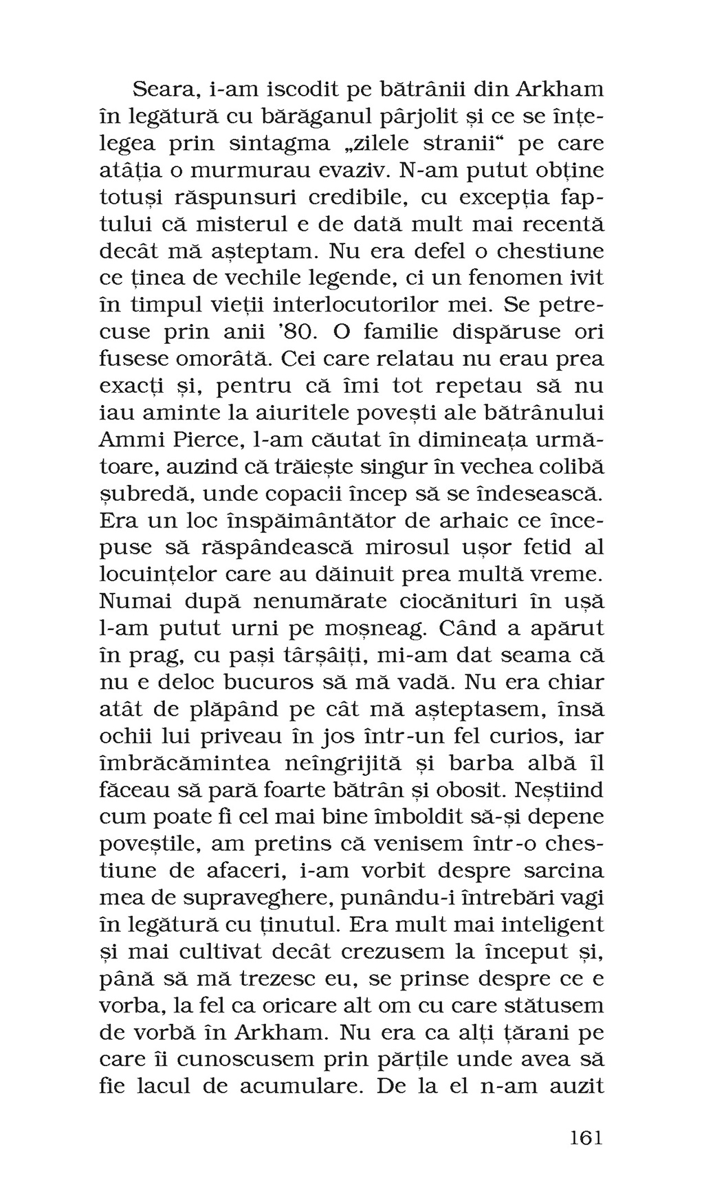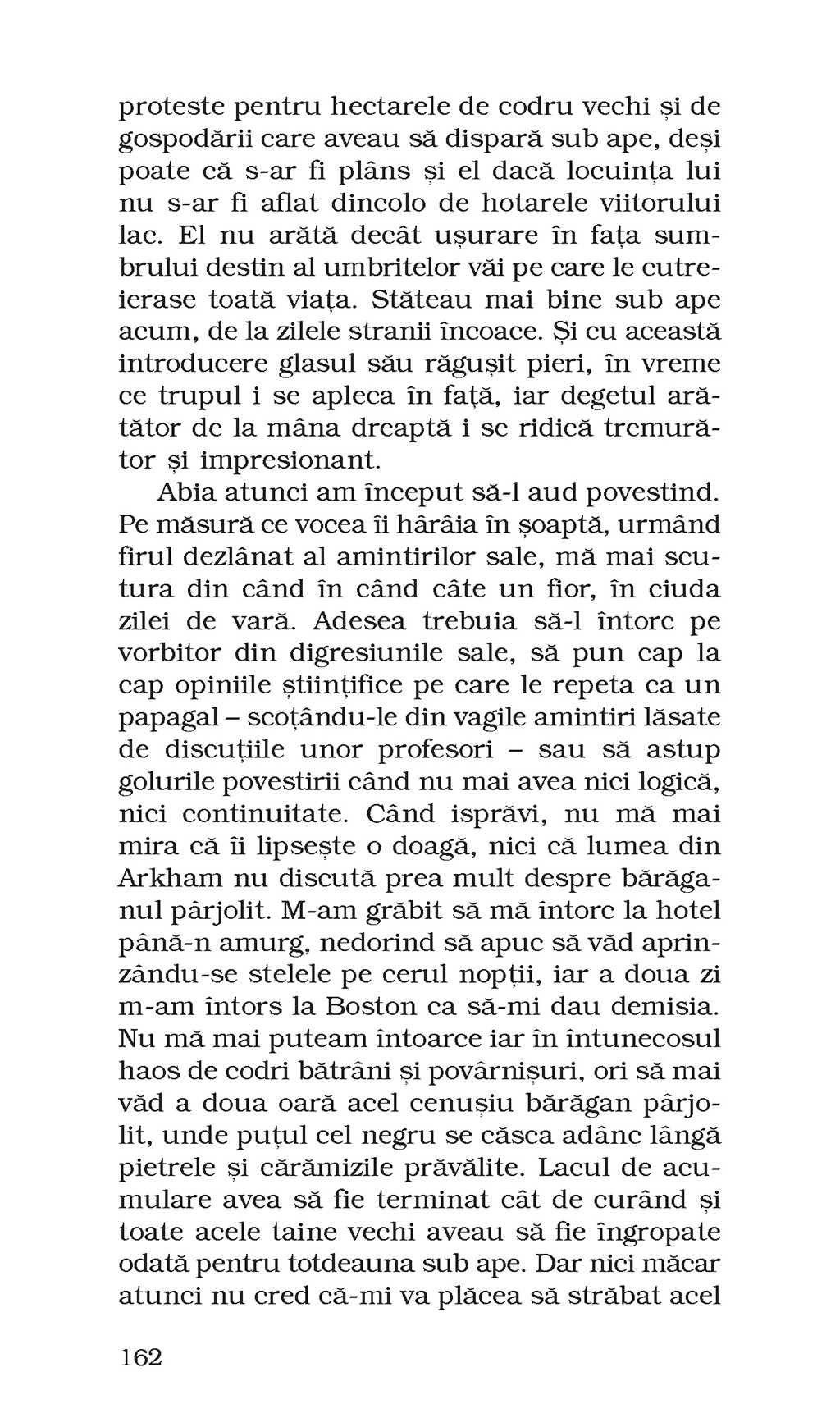 În cele douăsprezece povestiri care alcătuiesc volumul lui H.P. Lovecraft, scriitorul american închipuie omenirea ca pe un avanpost firav al firescului într-un univers altfel haotic şi ostil, ce ascunde o realitate poate prea înfricoşătoare pentru a fi pătrunsă de mintea omului. Personajele îşi istorisesc propria alienare şi cercetează necunoscutul, destrămînd vălul subţire ce le separă viaţa de teritoriul unor întîmplări teribile. Lovecraft trece de la evocarea tragică a singurătăţii şi izolării, în „Veneticul”, prin elemente de grotesc, în „Dulăul”, la îmbinarea genului horror cu SF, în „Cel care şuşotea în întuneric” şi „Chemarea lui Cthulhu”. Aceasta din urmă, piesa centrală a mitologiei lui Lovecraft, dezvăluie natura gigantului zeu Cthulhu şi ritualurile străvechi ce i se închină, vorbind despre slăbiciunea minţii omeneşti în faţa unei puteri izvorîte dintr-o inteligenţă nepămîntească.