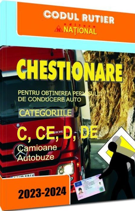 Menita sa faciliteze asimilarea și aprofundarea noțiunilor teoretice elementare de circulație rutiera in vederea obținerii permisului de conducere pentru camioane și autobuze, lucrarea CHESTIONARE PENTRU OBȚINEREA PERMISULUI DE CONDUCERE AUTO CATEGORIILE C, CE, D, DE reprezinta, de fapt, un pachet care include 30 de chestionare volante (15 pentru categoriile C, CE și 15 pentru categoriile D, DE) de cate 26 de intrebari fiecare, actualizate permanent, pentru verificarea cunoștințelor de circulație rutiera conform tematicii codului rutier in vigoare, precum și raspunsurile corecte ale acestora. Chestionarele sunt structurate conform modelului de chestionar de la examenul pentru obținerea permisului.
