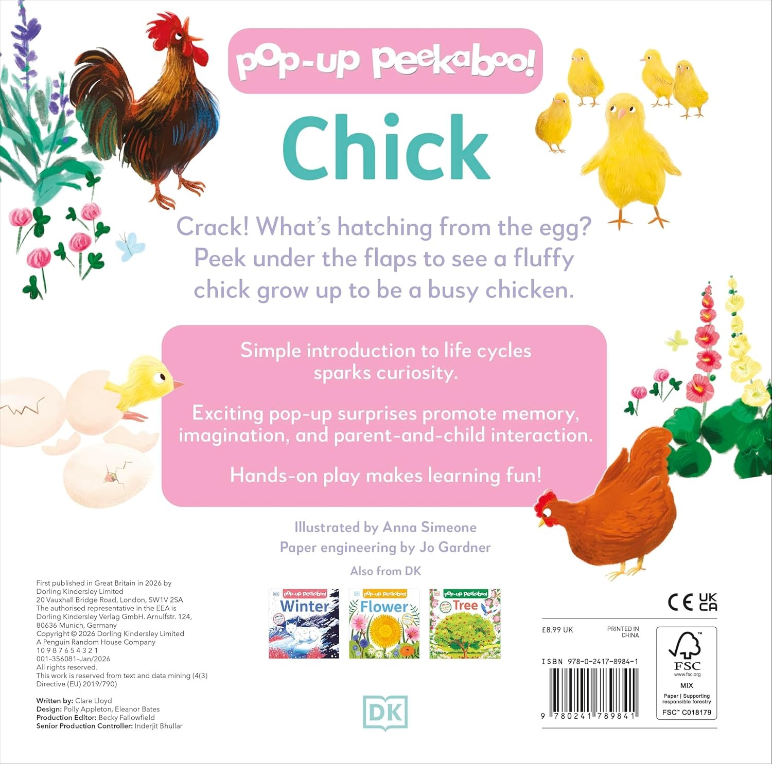 Bold, brightly coloured pictures, lift-the-flap pages, and entertaining rhymes bring Pop-Up Peekaboo! Chick to life, and provide lots of opportunities for parent-and-child interaction and hours of spring-themed fun. Learn all about little chicks and their lifecycles here!