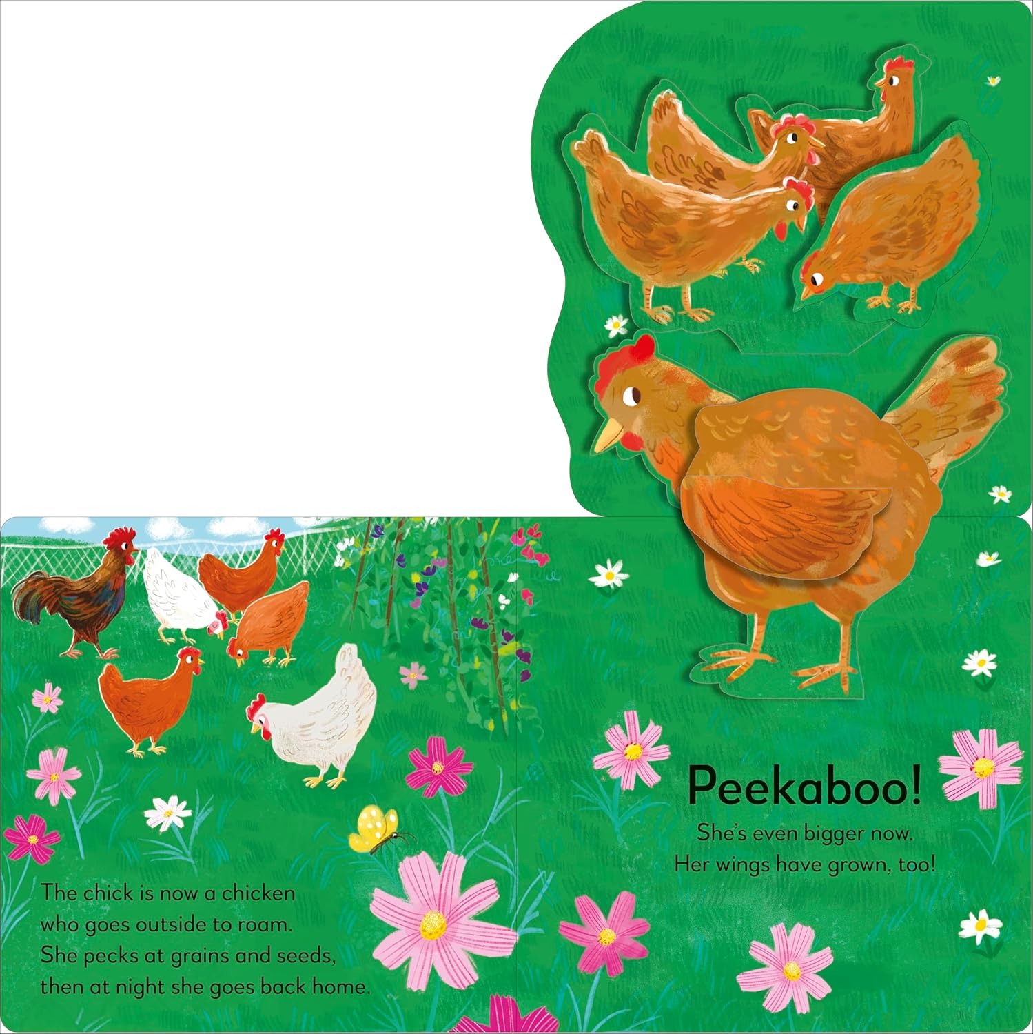 Babies and toddlers will love lifting big flaps to find five peekaboo surprises popping up from the pages: an egg wobbling in its nest, a tiny chick hatching from an egg, a fluffy chick growing into a feathery chicken and showing off its wings, a hen venturing outside to feed, and a mother hen with her brood of chirpy chicks hatching from their eggs. And the cycle begins again!