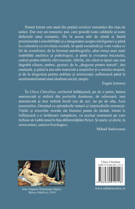 "In Chira Chiralina, scriitorul infatiseaza, pe de o parte, lumea amestecata si straina din porturile dunarene, de odinioara, mai amestecata si mai straina decat cea de azi; iar pe de alta, Asia neamurilor, Orientul cu splendorile naturii si turpitudinile omenesti. Vitiile si mizeriile morale ale bietului pumn de tarana, Istrati le infatiseaza c-o iertatoare cumpanire, cu acelasi sentiment pe care trebuie sa-l aiba omul in fata diformitatilor fizice. Si unele, si altele, la urma urmei, sunt tot fiziologice." Mihail Sadoveanu