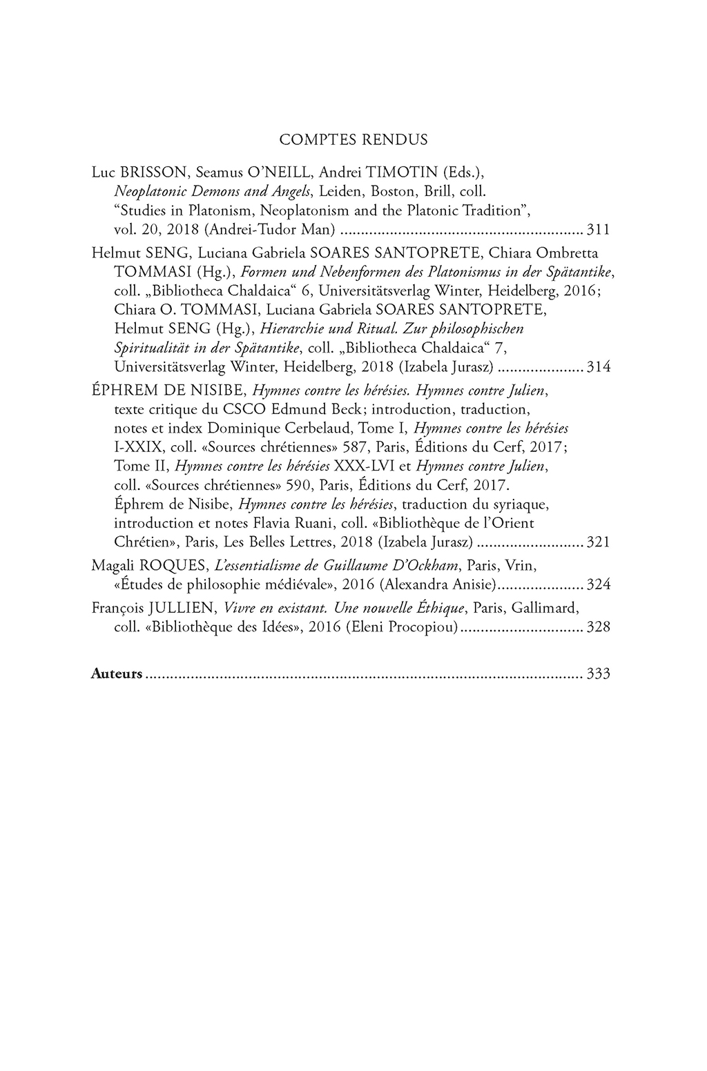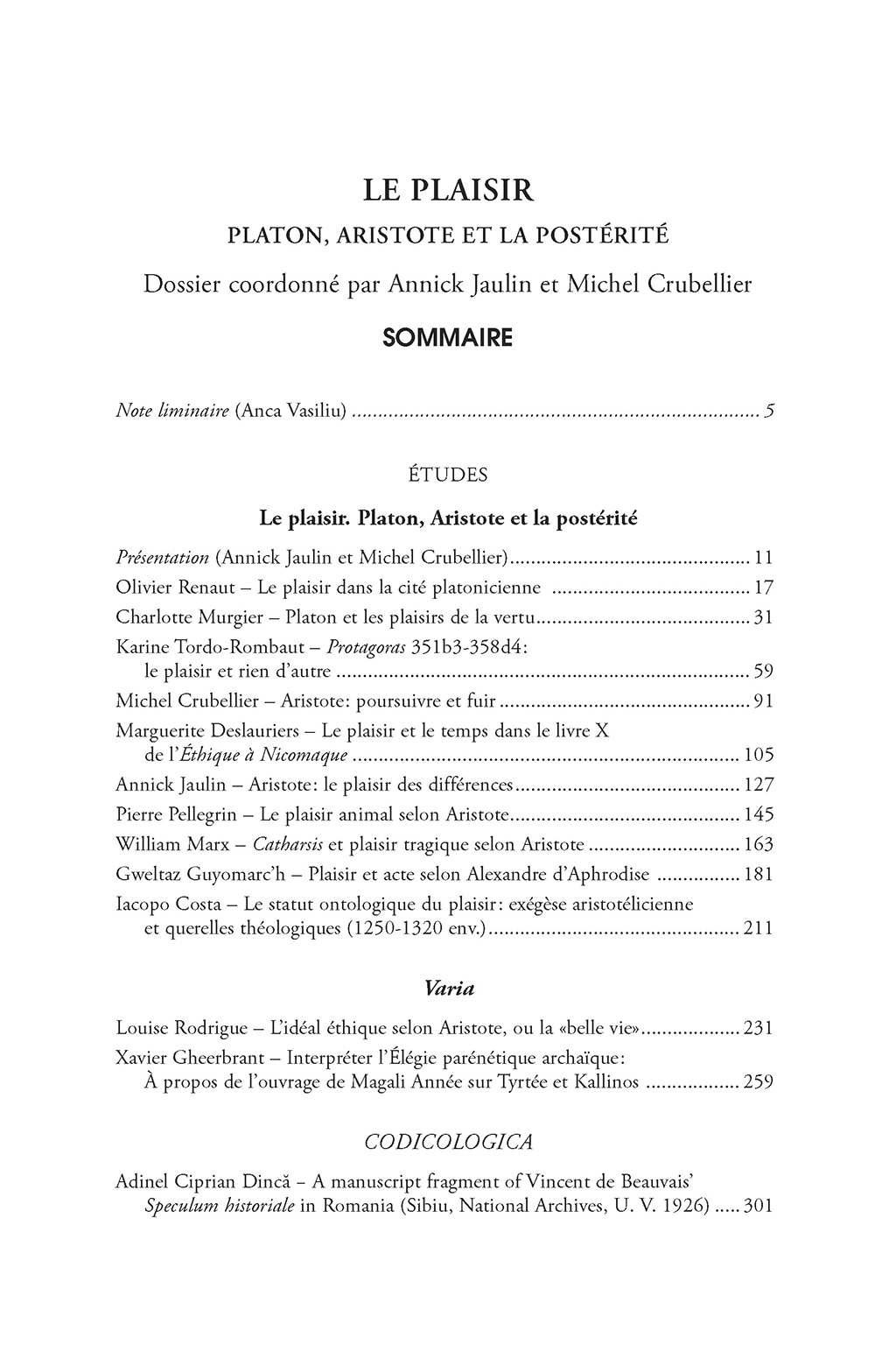 Présentation • Le plaisir dans la cité platonicienne • Platon et les plaisirs de la vertu • Protagoras 351b3-358d4: le plaisir et rien d’autre • Aristote: poursuivre et fuir • Le plaisir et le temps dans le livre X de l’Éthique á Nicomaque • Aristote: le plaisir des différences • Le plaisir animal selon Aristote • Catharsis et plaisir tragique selon Aristote • Plaisir et acte selon Alexandre d’Aphrodise • Le statut ontologique du plaisir: exégèse aristotélicienne et querelles théologiques (1250-1320 env.) • L’idéal éthique selon Aristote, ou la <<belle vie>>” • Interpréter l’Élégie parénétique archaïque: À propos de l’ouvrage de Magali Année sur Tyrtée et Kallinos • A manuscript fragment of Vincent de Beauvais’ Speculum historiale in Romania • Neoplatonic Demons and Angels • Formen und Nebenformen des Platonismus in der Spätantike • Hymnes contre les hérésies. Hymnes contre Julien • L’essentialisme de Guillaume D’Ockham • Vivre en existant. Une nouvelle Éthique
