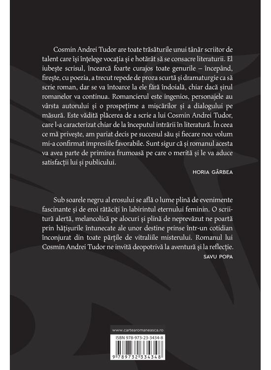 Sub soarele negru al erosului se află o lume plină de evenimente fascinante și de eroi rătăciți în labirintul eternului feminin. O scriitură alertă, melancolică pe alocuri și plină de neprevăzut ne poartă prin hățișurile întunecate ale unor destine prinse într-un cotidian înconjurat din toate părțile de vitraliile misterului. Romanul lui Cosmin Andrei Tudor ne invită deopotrivă la aventură și la reflecție.