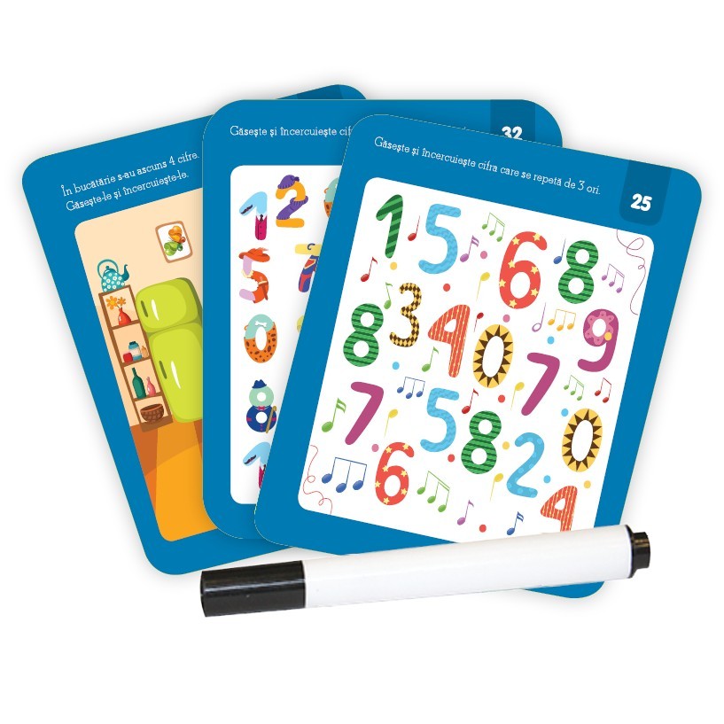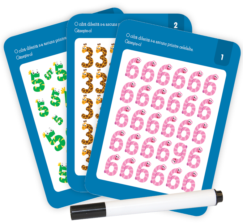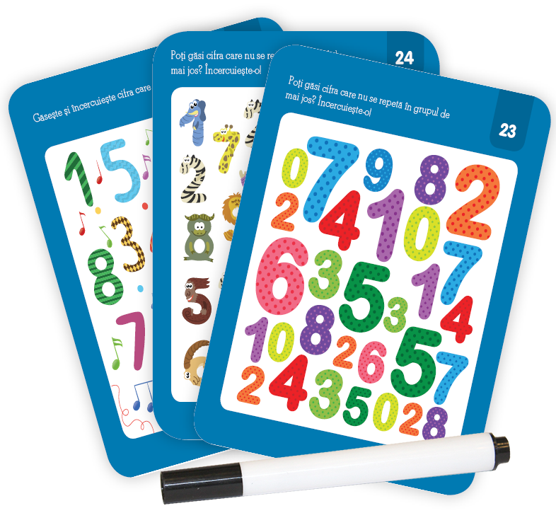 Pachetul include 6 tipuri de jocuri: găsește ce e diferit • numără și scrie câte sunt • găsește toate perechile • descoperă ce lipsește • descoperă ce se repetă de un număr de ori • găsește cifrele ascunse.