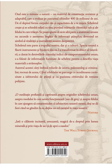 Autorul acestei cărţi îmbină rolurile de istoric, paleontolog şi criminalist; tocmai de aceea, Cifrul scheletului se parcurge cu iscoditoarea curiozitate a iubitorului de ştiinţă şi cu pasiunea cititorului de romane poliţiste.