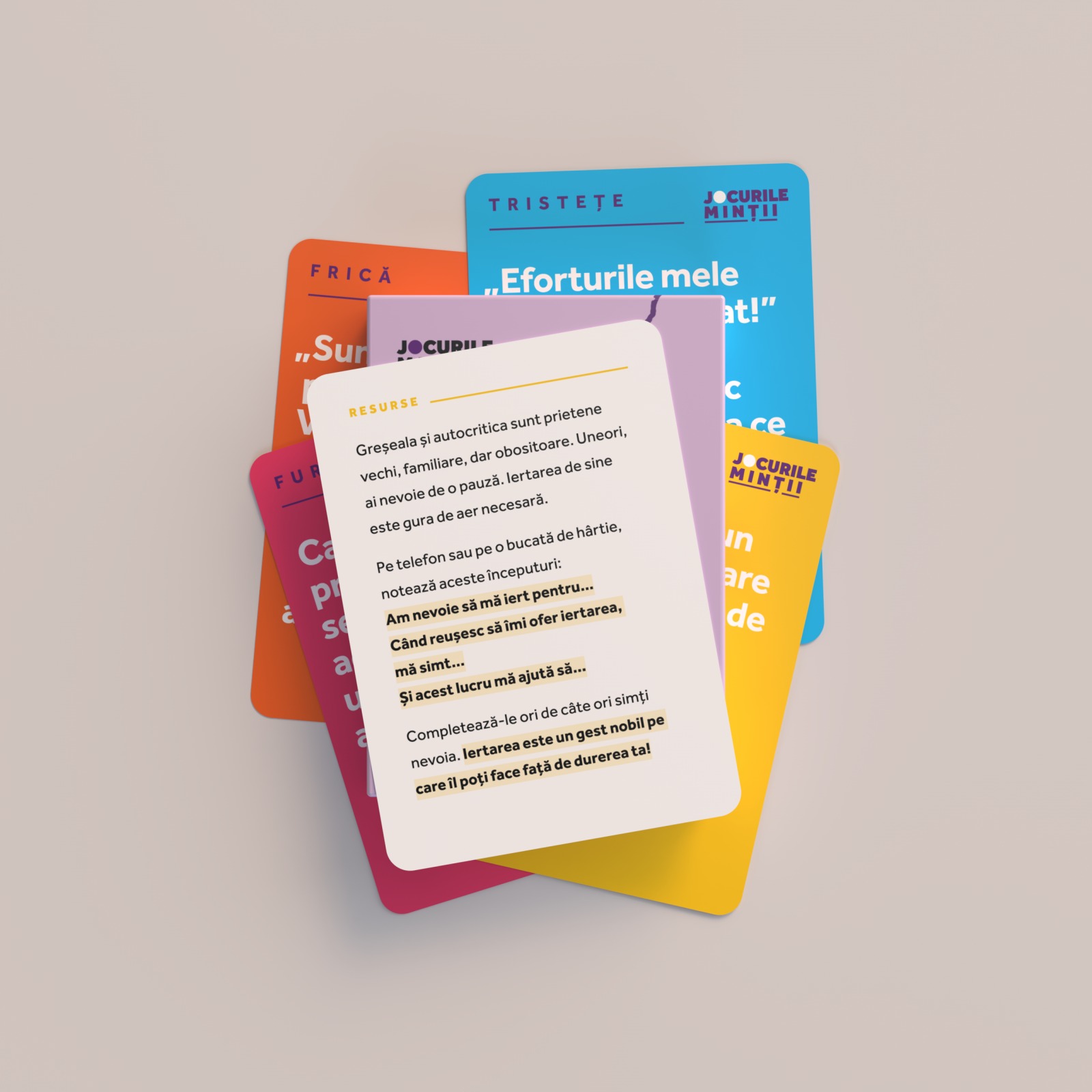 „5 minute pentru tine, Mamă” este un set de carduri gândit special pentru mamele care simt că emoțiile lor trec pe planul secund. Cu exerciții simple și eficiente, această cutie cu carduri te ajută să navighezi momentele de furie, frică sau tristețe, dar și să îți reîncarci bateriile emoționale, practicând exerciții prin care să îți activezi resursele.
