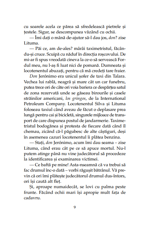 Dacă te faci polițist, trebuie să ai inimă de piatră, își dă cu părerea cineva. Dar jandarmul Lituma își pierde cumpătul când vede cu câtă bestialitate a fost ucis tânărul Palomino Molero, din trupele de aviație. Cât despre locotenentul Silva, șeful lui, el e topit după doña Adriana, trupeșa patroană a unui modest birt. Și, ca și cum toate acestea nu ar fi de ajuns, ancheta conduce spre „peștii cei mai mari“, ofițerii de la Baza aeriană, care încearcă să mușamalizeze totul.