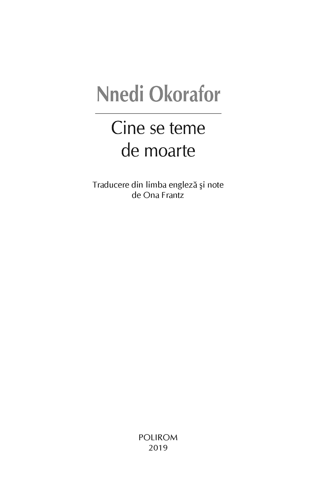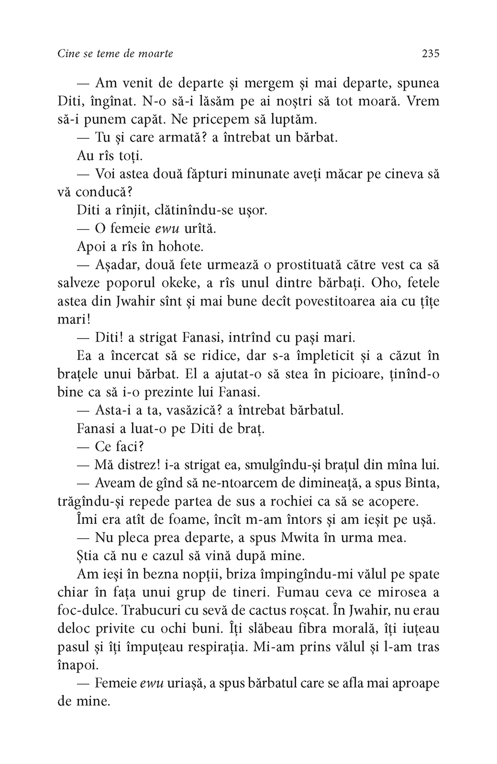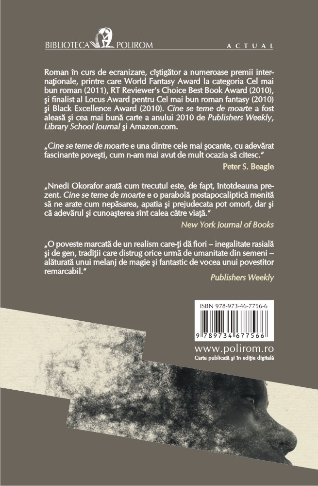 Într-un Sudan al viitorului, împletind tehnologia cu vrăjitoria pe un fundal al confruntărilor multiple între etnii, între sexe, între opresori de tot felul, cei oprimați sînt tot mai puțin conștienți de statutul de victimă. Niciodată Africa, în toată stranietatea ei magică și violentă, nu a fost mai fascinantă decît în povestea acestei adolescente cu părul și pielea de culoarea nisipului, pe nume Onyesonwu (Cine-se-teme-de-moarte). Cine se teme de moarte este romanul unui copil al deșertului, al brutalității, al vrăjitoriei, povestea celei în stare să rescrie în Marea Carte destinul a două popoare. Și poate destinele viitorilor cititori ai acestei mari cărți.