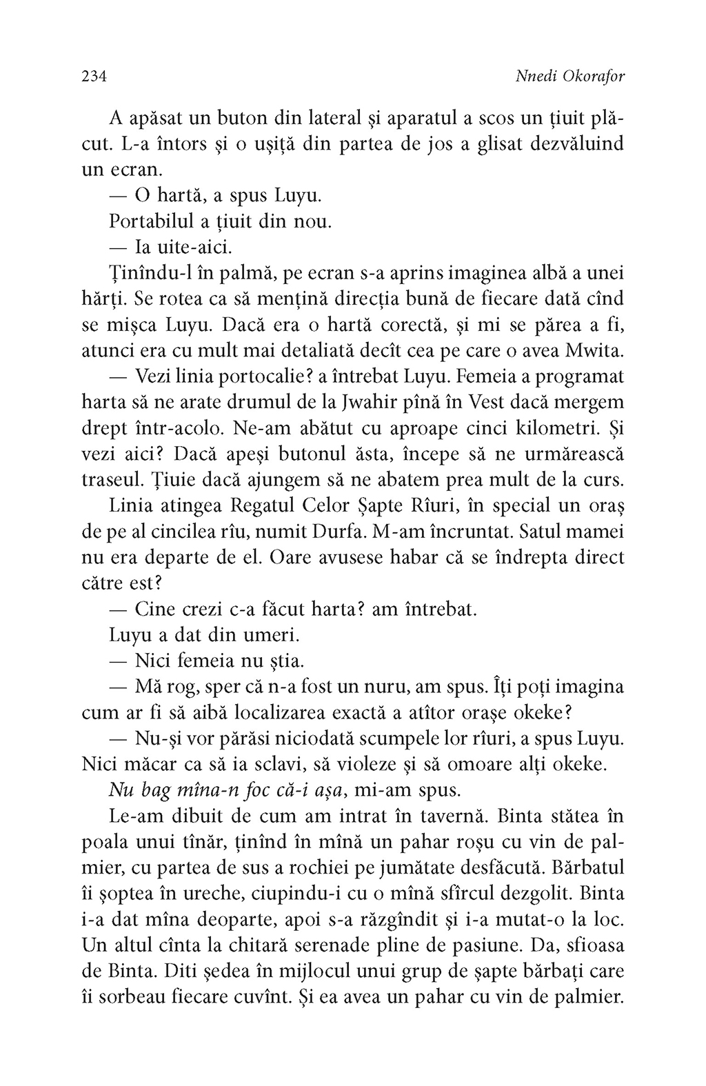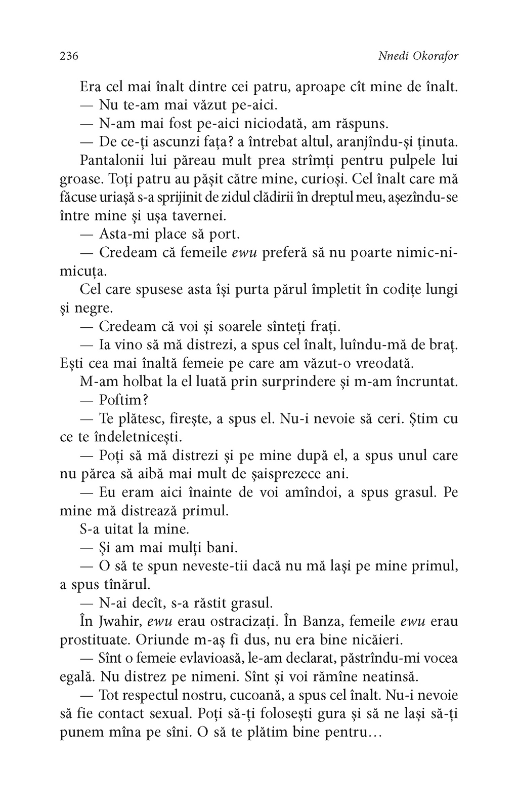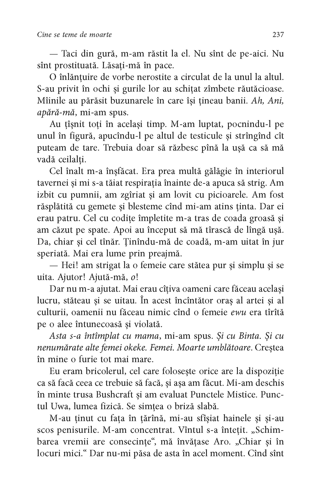 Într-un Sudan al viitorului, împletind tehnologia cu vrăjitoria pe un fundal al confruntărilor multiple între etnii, între sexe, între opresori de tot felul, cei oprimați sînt tot mai puțin conștienți de statutul de victimă. Niciodată Africa, în toată stranietatea ei magică și violentă, nu a fost mai fascinantă decît în povestea acestei adolescente cu părul și pielea de culoarea nisipului, pe nume Onyesonwu (Cine-se-teme-de-moarte). Cine se teme de moarte este romanul unui copil al deșertului, al brutalității, al vrăjitoriei, povestea celei în stare să rescrie în Marea Carte destinul a două popoare. Și poate destinele viitorilor cititori ai acestei mari cărți.