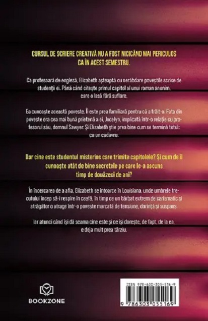 Ca profesoară de engleză, Elizabeth așteaptă cu nerăbdare poveștile scrise de studenții ei. Până când citește primul capitol al unui roman anonim care o lasă fără suflare. Ea cunoaște această poveste. Fata din poveste era cea mai bună prietenă a ei, Jocelyn, implicată într-o relație cu profesorul ei, domnul Sawyer. Și Elizabeth știe prea bine cum se termină totul: cu un cadavru. Dar cine este studentul misterios care trimite capitolele? Și cum de îi cunoaște atât de bine secretele pe care le-a ascuns timp de douăzeci de ani?