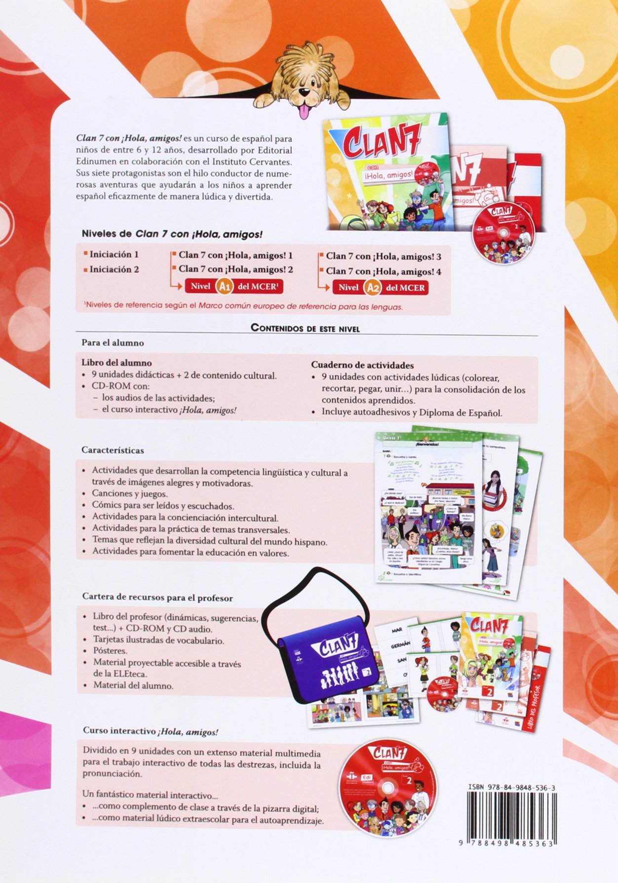 Clan 7 con ¡Hola, amigos! Nivel 2 es un curso de español para niños de entre 6 y 12 años, desarrollado por Editorial Edinumen en colaboración con el Instituto Cervantes. Sus siete protagonistas son el hilo conductor de numerosas aventuras que ayudarán a los niños a aprender español de manera lúdica y divertida. El Libro del alumno se divide en 9 unidades que siguen los contenidos del Plan curricular del Instituto Cervantes, en correspondencia con los contenidos desarrollados en el curso interactivo ¡Hola, amigos!, incluido en el CD-ROM y desarrollado por el Instituto Cervantes en colaboración con la Universidad de Alberta (Canadá).Se trabaja con las últimas tendencias metodológicas en la Educación Primaria y en el proceso de enseñanza/aprendizaje de idiomas a niños.Actividades que desarrollan la competencia lingüística y cultural a través de imágenes alegres y motivadoras y con los contenidos secuenciados atendiendo a la edad y nivel del niño.Se tratan temas transversales y se fomenta la educación en valores.Se contempla la diversidad cultural del mundo de habla hispana y se potencia la conciencia intercultural.Se desarrolla una metodología activa, en interacción continua con el profesor y con la presencia constante del elemento lúdico, que favorece el aprendizaje y socialización de los niños.Se incluye un CD-ROM con el curso interactivo ¡Hola, amigos!, con el que los niños desarrollarán su competencia digital y autonomía.
