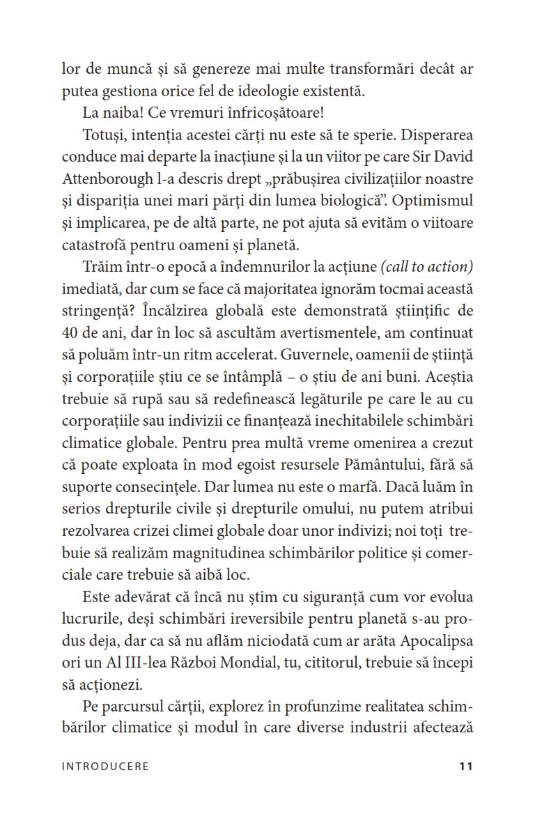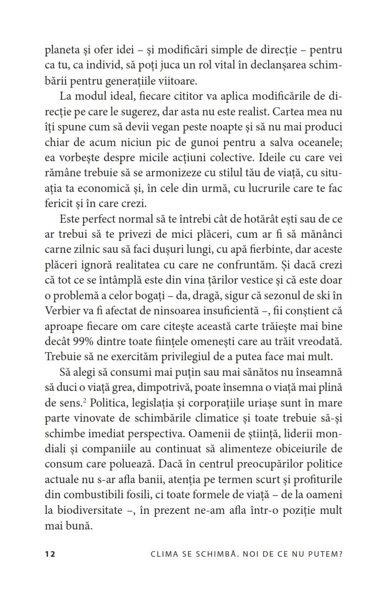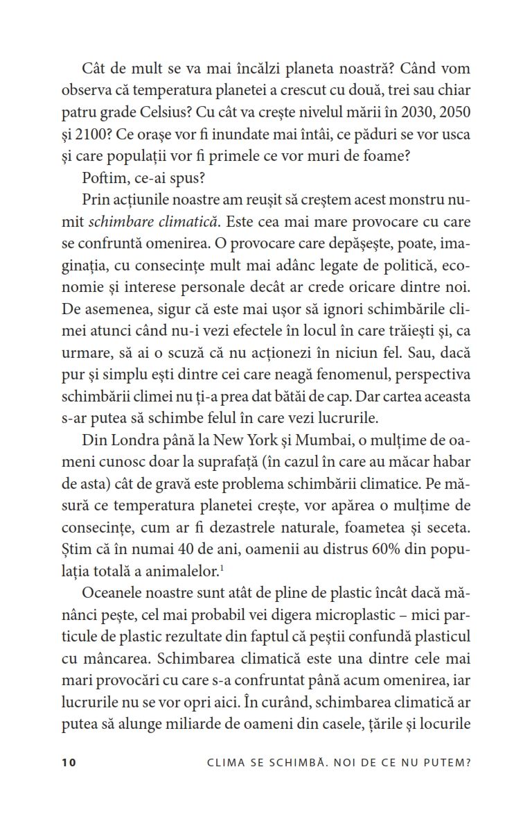 Nu vom încerca să vă convingem că schimbările climatice există – noi deja știm acest lucru. Cartea doar vă oferă informații ușor de înțeles despre structurile care ne sufocă viitorul, menținând în același timp un sentiment de optimism și umanizând povestea climatică.