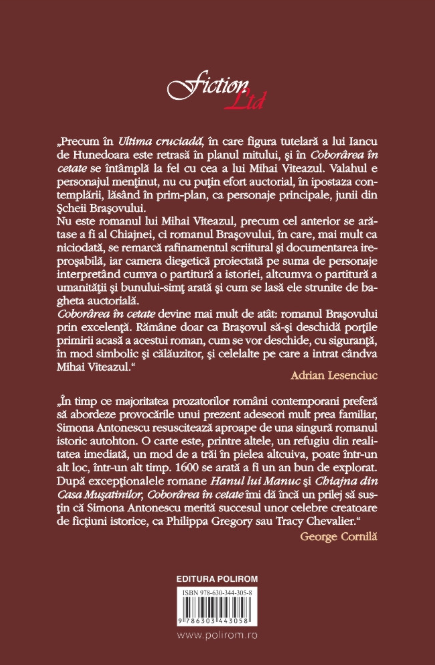 „În timp ce majoritatea prozatorilor români contemporani preferă să abordeze provocările unui prezent adeseori mult prea familiar, Simona Antonescu resuscitează aproape de una singură romanul istoric autohton. O carte este, printre altele, un refugiu din realitatea imediată, un mod de a trăi în pielea altcuiva, poate într-un alt loc, într-un alt timp. 1600 se arată a fi un an bun de explorat. După excepționalele romane Hanul lui Manuc și Chiajna din Casa Mușatinilor, Coborârea în cetate îmi dă încă un prilej să susțin că Simona Antonescu merită succesul unor celebre creatoare de ficțiuni istorice, ca Philippa Gregory sau Tracy Chevalier.”