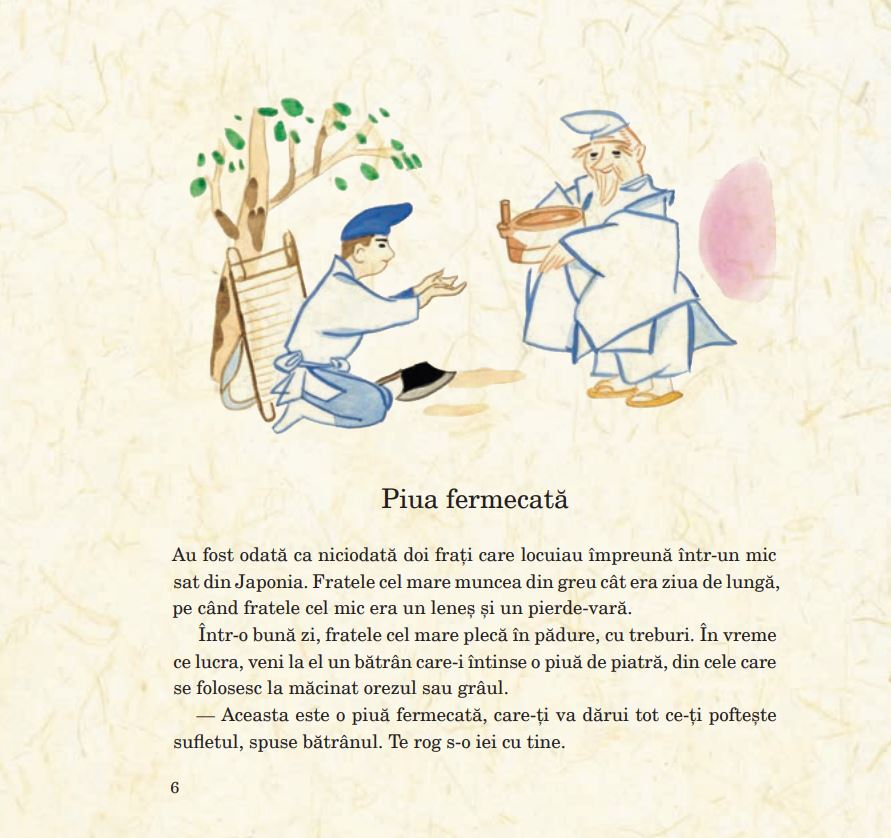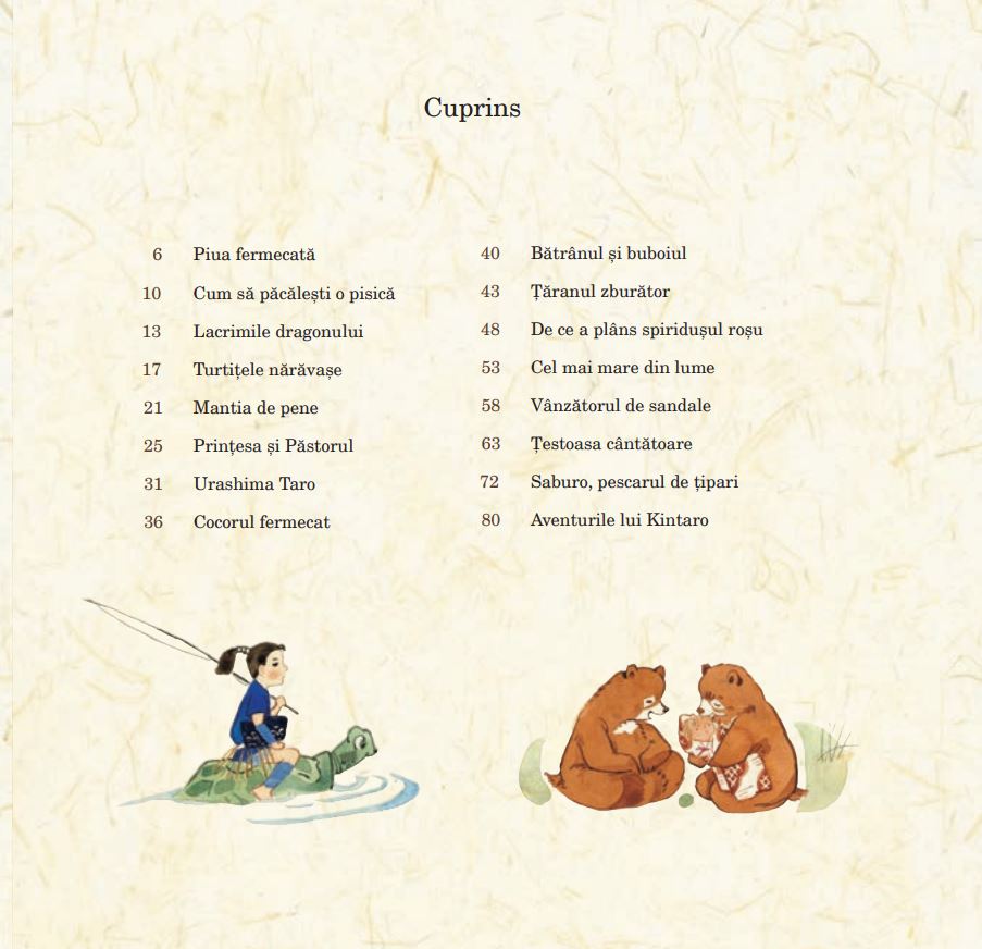 Cocorul fermecat, țestoasa cântătoare, dragonul care plânge, șoriceii cu puteri magice și prințesele care stăpânesc în văzduh sau peste mări sunt numai câteva dintre personajele acestei minunate cărți de povești din Ţara Soarelui-Răsare. Întâmplările surprinzătoare cu deznodăminte neașteptate prin care trec cu toții ne poartă într-o lume fermecată în care o mantie de pene se poate preface în aripile unui înger, iar un vânzător de cărbune, într-un spiriduș.