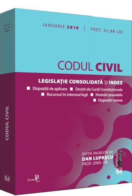 Lucrarea Codul civil: ianuarie 2019 (editia a 6-a), ingrijita de prof. univ. dr. Dan Lupascu si tiparita pe hartie alba de calitate superioara, cuprinde Codul civil (Legea nr. 287/2009), actualizat, articolele Codului fiind insotite, acolo unde este cazul, de: dispozitii tranzitorii si de aplicare, dispozitii conexe, extrase din Constitutia Romaniei, decizii CNA, decizii ale Curtii Constitutionale, recursuri in interesul legii si hotarari prealabile – necesare unei depline intelegeri a reglementarii.