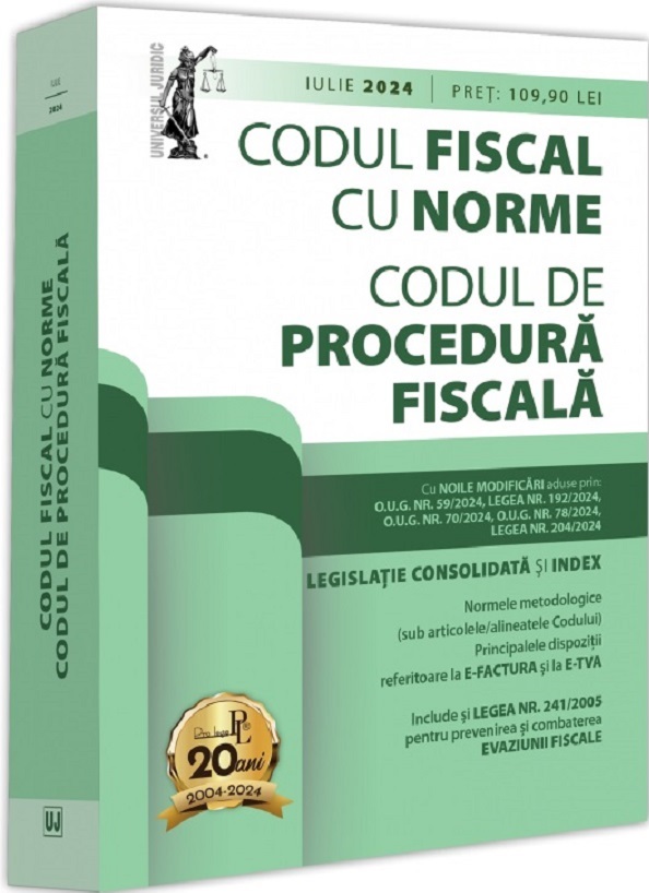 Editia a 8-a (revizuita) a lucrarii, Codul fiscal cu Norme si Codul de procedura fiscala: iulie 2024, tiparita pe hartie alba de calitate superioara, include noile modificari aduse prin: O.U.G. nr. 59/2024 (M. Of. nr. 534 din 7 iunie 2024); Legea nr. 192/2024 (M. Of. nr. 576 din 20 iunie 2024); O.U.G. nr. 70/2024 (M. Of. nr. 582 din 21 iunie 2024); O.U.G. nr. 78/2024 (M. Of. nr. 596 din 26 iunie 2024); Legea nr. 204/2024 (M. Of. nr. 600 din 27 iunie 2024).