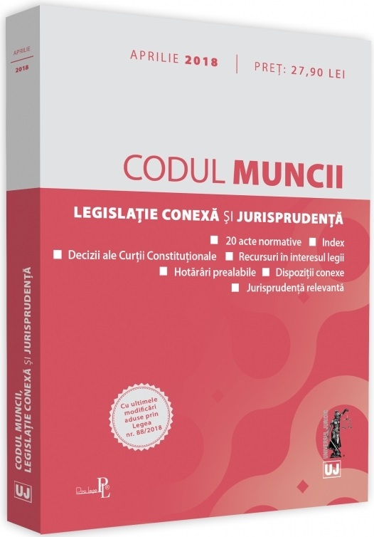 Lucrarea Codul muncii, legislatie conexa si jurisprudenta. Legislatie consolidata si index: aprilie 2018 contine, pe langa textul Codului (cu ultimele modificari aduse prin L. nr. 64/2018 – M. Of. nr. 226 din 13 martie 2018 si prin L. nr. 88/2018 – M. Of. nr. 315 din 10 aprilie 2018), Legea dialogului social nr. 62/2011, un extras din Constitutia Romaniei, decizii ale Curtii Constitutionale, recursuri in interesul legii, hotarari prealabile, jurisprudenta relevanta si acte normative conexe importante: