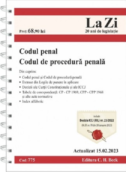 Noua ediție a culegerii conţine atât Codul penal şi Codul de procedură penală consolidate la zi, cât şi extrase din Legile pentru punerea în aplicare a acestora. În conținutul lor sunt incluse şi modificările aduse prin actele normative adoptate de la ultima ediție, precum și jurisprudența relevantă inclusă în lucrare, dintre care putem aminti Decizia ICCJ (RIL) nr. 23/2022 (M.Of. nr. 78 din 30 ianuarie 2023), Decizia ICCJ (HP) nr. 78/2022 (M.Of. nr. 51 din 18 ianuarie 2023) sau D.C.C. din 31 ianuarie 2023 (nepublicată), prin care Curtea Constituțională a admis excepția de neconstituționalitate și a constatat că dispozițiile art. 2521 alin. (1) din Codul de procedură penală (…) sunt neconstituționale în măsura în care nu prevăd judecătorul de cameră preliminară printre organele judiciare care pot dispune valorificarea bunurilor mobile sechestrate.