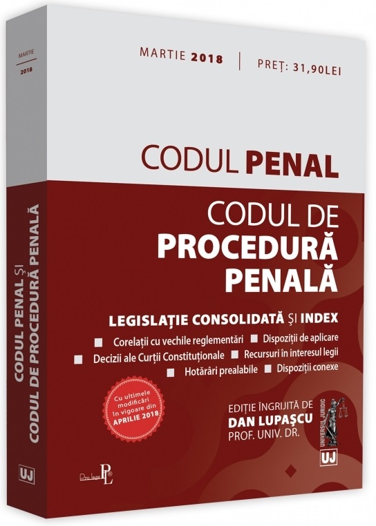 Editia 7 a lucrarii Codul penal si Codul de procedura penala. Legislatie consolidata si index: martie 2018, tiparita pe hartie alba de calitate superioara si ingrijita de prof. univ. dr. Dan Lupascu, cuprinde Codul penal si Codul de procedura penala, actualizate in martie 2018, articolele celor doua Coduri fiind insotite, acolo unde este cazul, de dispozitii tranzitorii, de aplicare sau conexe, necesare unei depline intelegeri a reglementarii.