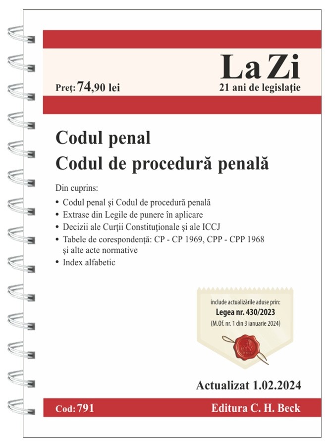 - Legea nr. 401/2023 pentru modificarea art. 437 din Legea nr. 286/2009 privind Codul penal (M.Of. nr. 1132 din 14 decembrie 2023);
