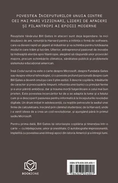 Codul sursă este prima autobiografie a lui Bill Gates—sinceră, surprinzătoare și plină de momente care i-au definit drumul de la un copil fascinat de computere la omul care a schimbat lumea. De la primele linii de cod scrise noaptea în secret și până la deciziile care au schimbat lumea, această carte îți oferă sfaturi înțelepte despre cum să-ți construiești propriul viitor, de la o personalitate marcantă a secolului XXI.