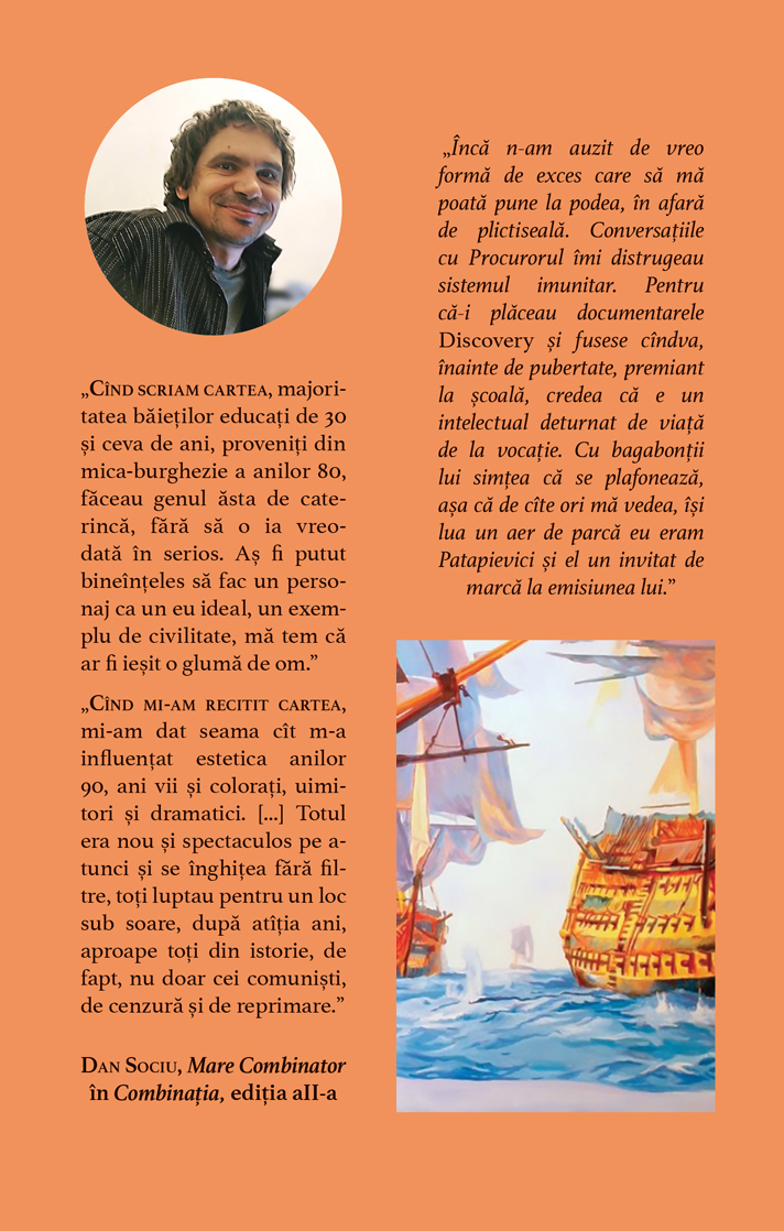 Cind mi-am recitit cartea mi-am dat seama cit m-a influentat estetica anilor 90 ani vii si colorati uimitori si dramatici. Totul era nou si spectaculos pe atunci si se inghitea fara filtre toti luptau pentru un loc sub soare dupa atitia ani aproape toti din istorie de fapt nu doar cei comunisti de cenzura si de reprimare. -- Dan Sociu Mare Combinator in Combinatia editia a II-a