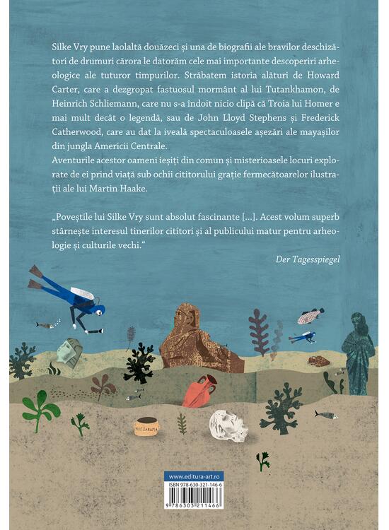 Silke Vry pune laolaltă douăzeci și una de biografii ale bravilor deschizători de drumuri cărora le datorăm cele mai importante descoperiri arheologice ale tuturor timpurilor. Străbatem istoria alături de Howard Carter, care a dezgropat fastuosul mormânt al lui Tutankhamon, de Heinrich Schliemann, care nu s-a îndoit nicio clipă că Troia lui Homer e mai mult decât o legendă, sau de John Lloyd Stephens și Frederick Catherwood, care au dat la iveală spectaculoasele așezări ale mayașilor din jungla Americii Centrale.