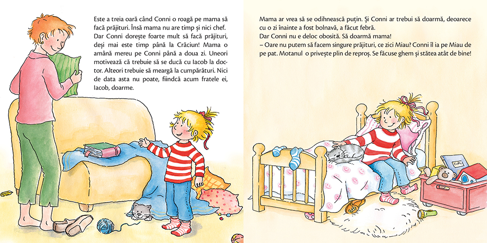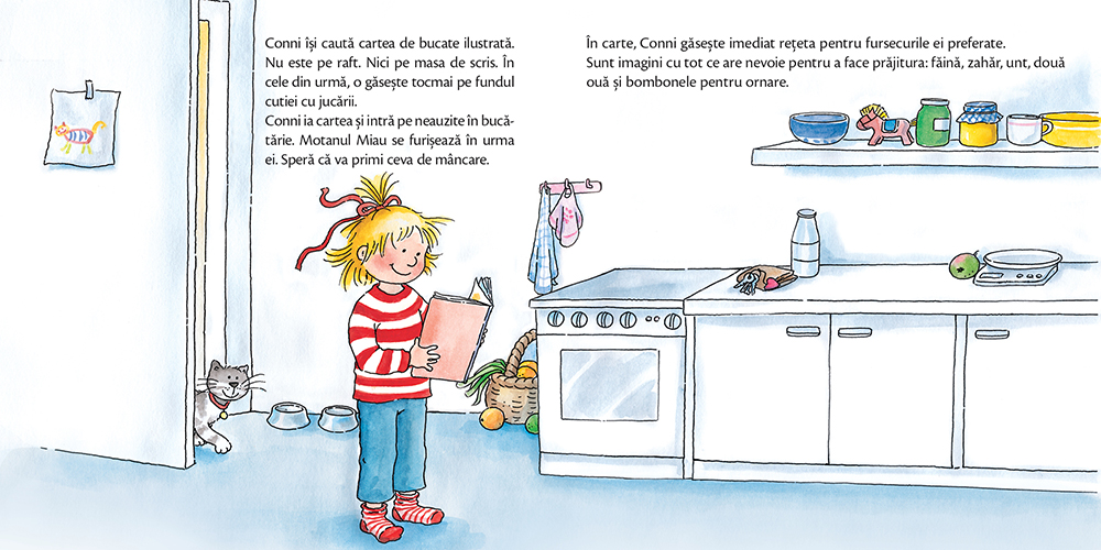 Conni ar vrea să facă fursecuri, dar mama ei nu are timp. Conni se apucă să le facă singură... sparge ouăle, cerne făina, ferește aluatul de motanul Miau - nu e deloc ușor! Ce bine că, în cele din urmă, mama îi vine în ajutor.