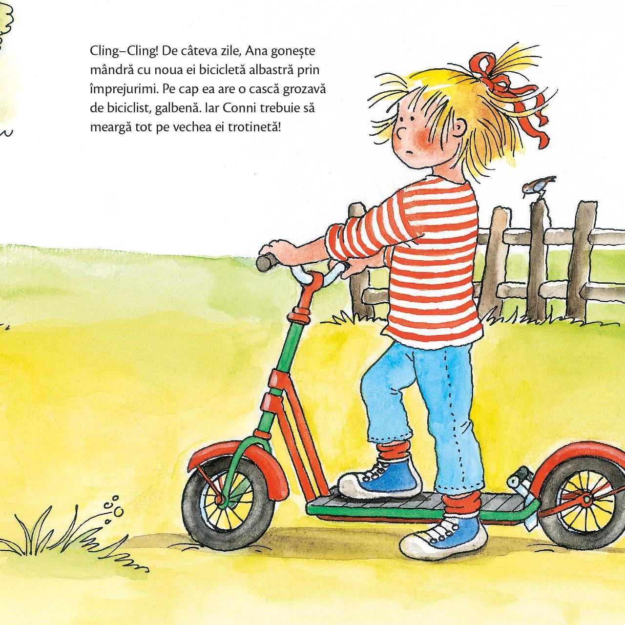 Deoarece Conni merge acum atât de bine pe bicicletă, tata și mama fac duminică împreună cu ea un tur cu bicicletele. Acum doar Iacob mai trebuie să stea în scaunul de copii. Conni merge fără roți ajutătoare pe noua ei bicicletă roșie. Iar când mama întinde mâna pentru a arăta că vrea să cotească, Conni face la fel.