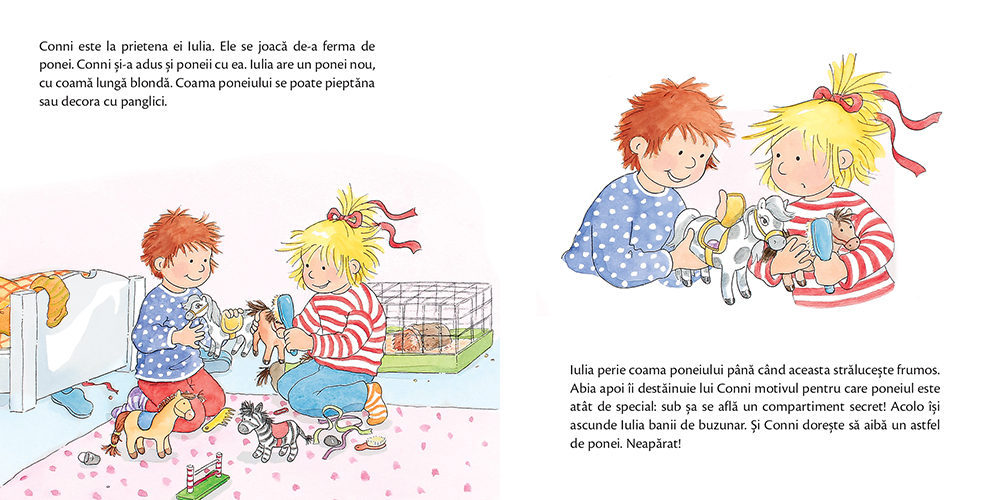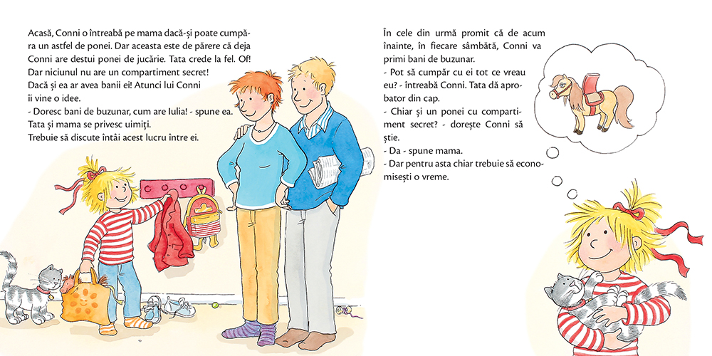 În sfârșit, Conni primește bani de buzunar. Ea pune fiecare monedă în pușculița galbenă cu flori roșii, în formă de porcușor. Și, când pușculița este plină, își cumpără mult doritul ponei de jucărie cu ascunzătoare secretă.