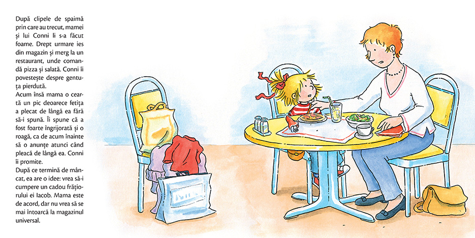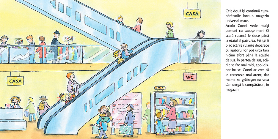 La început ea plânge disperată, imaginându-şi că va trebui să-şi petreacă restul vieţii în magazin singură, fără mama. Apoi chiar în momentul în care-şi aminteşte ce are de făcut în cazul în care se pierde, aude la difuzorul magazinului un anunţ, care o informează că mama o aşteaptă la casieria de lângă scările rulante. Bucuroasă, Conni aleargă să o îmbrăţişeze.