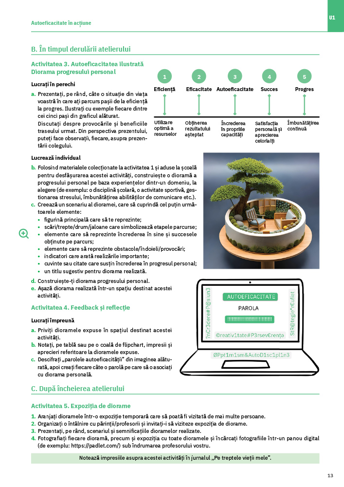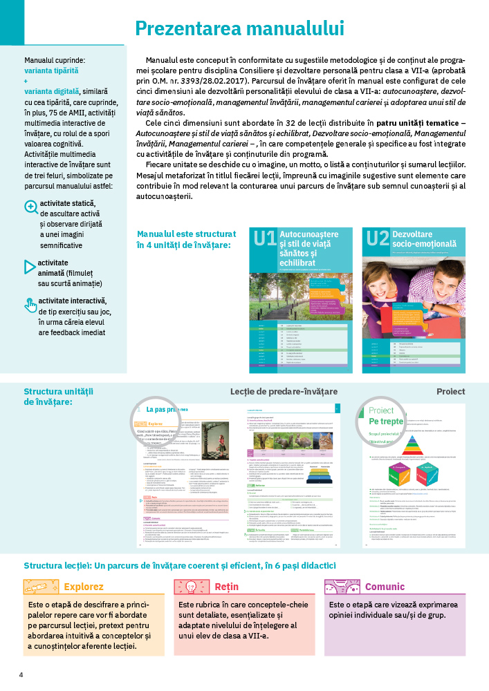 Cele patru unități, cu titluri sugestive pentru conținutul abordat, cuprind lecții numerotate ascendent și în simbioză tematică. Se asigură astfel un traseu de învățare coerent, care ne dorim să provoace curiozitatea și interesul elevilor pentru o învățare cu sens, bazată pe achiziții necesare unei transformări durabile și unei dezvoltări armonioase. Toate unitățile se finalizează cu o secvență de (auto)evaluare, construită într-un mod prietenos, astfel încât să fie conștientizate etapele parcurse și transformările survenite. Fiecare lecție are un titlu sugestiv, fiind construită din secvențe bine definite, care se vor desfășura în clasă. Activitățile propuse în lecții vizează lucrul individual, în perechi și în grup, asigurându-se un traseu de învățare care contribuie, în mod progresiv, atât la dezvoltarea autonomiei, cât și a cooperării în învățare. Metodele complementare de evaluare utilizate în acest manual sunt: portofoliul (în format letric și/sau electronic), proiectul, atelierul, observarea sistematică a activității și a comportamentului elevilor (prin liste de control, fișe de observare, scări de apreciere/verificare, chestionare, cum ar fi, de exemplu, la paginile 17, 21, 35, 36, 41, 49, 60, 64, 88, 92), investigația, autoevaluarea.