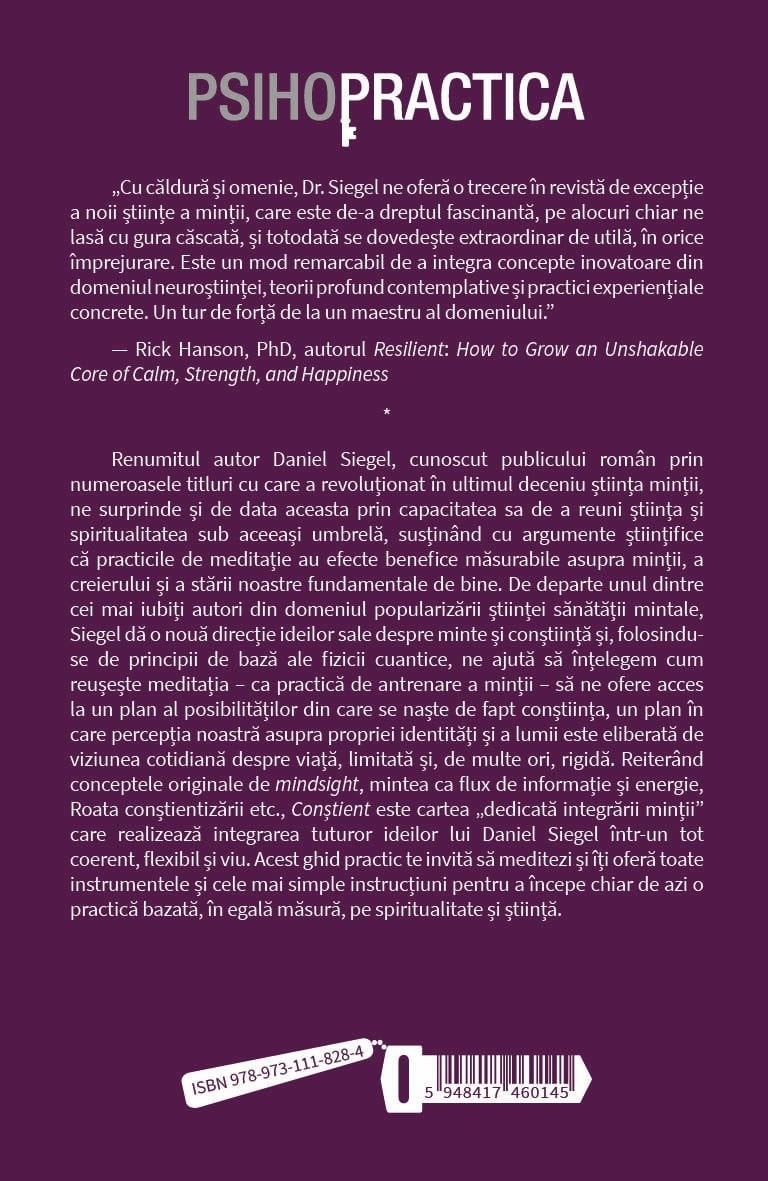 Renumitul autor Daniel Siegel, cunoscut publicului roman prin numeroasele titluri cu care a revolutionat in ultimul deceniu stiinta mintii, ne surprinde si de data aceasta prin capacitatea sa de a reuni stiinta si spiritualitatea sub aceeasi umbrela, sustinand cu argumente stiintifice ca practicile de meditatie au efecte benefice masurabile asupra mintii, a creierului si a starii noastre fundamentale de bine. De departe unul dintre cei mai iubiti autori din domeniul popularizarii stiintei sanatatii mintale, Siegel da o noua directie ideilor sale despre minte si constiinta si, folosindu-se de principii de baza ale fizicii cuantice, ne ajuta sa intelegem cum reuseste meditatia – ca practica de antrenare a mintii – sa ne ofere acces la un plan al posibilitatilor din care se naste de fapt constiinta, un plan in care perceptia noastra asupra propriei identitati si a lumii este eliberata de viziunea cotidiana despre viata, limitata si, de multe ori, rigida. Reiterand conceptele originale de mindsight, mintea ca flux de informatie si energie, Roata constientizarii etc., Constient este cartea „dedicata integrarii mintii” care realizeaza integrarea tuturor ideilor lui Daniel Siegel intr-un tot coerent, flexibil si viu. Acest ghid practic te invita sa meditezi si iti ofera toate instrumentele si cele mai simple instructiuni pentru a incepe chiar de azi o practica bazata, in egala masura, pe spiritualitate si stiinta.