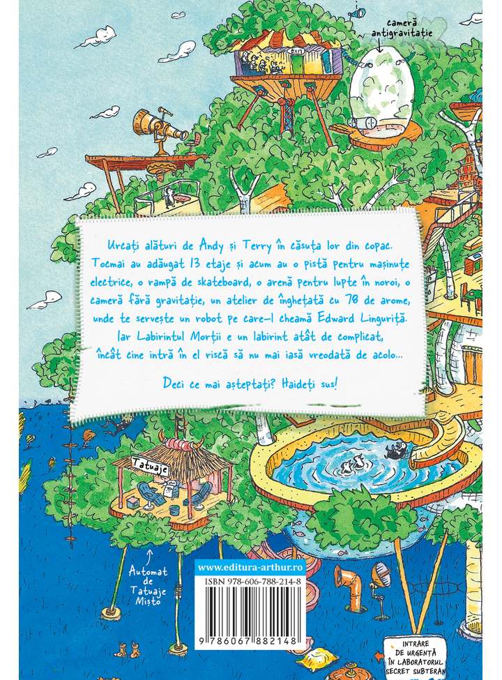 Tocmai au adăugat 13 etaje și acum au o pistă pentru mașinuțe electrice, o rampă de skateboard, o arenă pentru lupte în noroi, o cameră fără gravitație, un atelier de înghețată cu 78 de arome, unde te servește un robot pe care-l cheamă Edward Linguriță. Iar Labirintul Morții e un labirint atât de complicat, încât cine intră în el riscă să nu mai iasă vreodată de acolo...