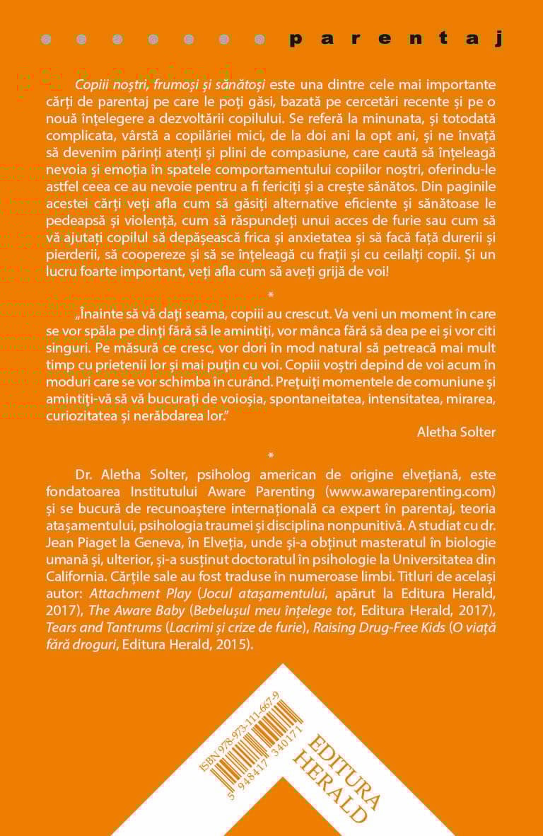 Copiii nostri frumosi si sanatosi este una dintre cele mai importante carti de parentaj pe care le poti gasi, bazata pe cercetari recente si o noua intelegere a dezvoltarii copilului. Se refera la minunata, si totodata complicata, varsta a copilariei, de la doi ani la opt ani, si ne invata sa devenim parinti atenti si plini de compasiune, care cauta sa inteleaga nevoia si emotia in spatele comportamentului copiilor nostri, oferindu-le astfel ceea ce au nevoie pentru a fi fericiti si a creste sanatos. Din paginile acestei carti veti afla cum sa gasiti alternative eficiente si sanatoase le pedeapsa si violenta, cum sa raspundeti unui acces de furie sau cum sa va ajutati copilul sa depaseasca frica si anxietatea si sa faca fata durerii si pierderii, sa coopereze si sa se inteleaga cu fratii si ceilalti copii. Si un lucru foarte important, veti afla cum sa aveti grija de voi!