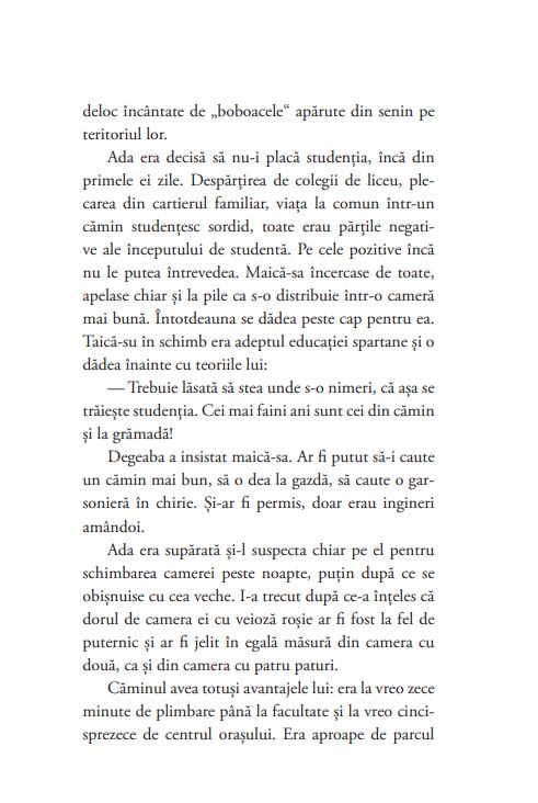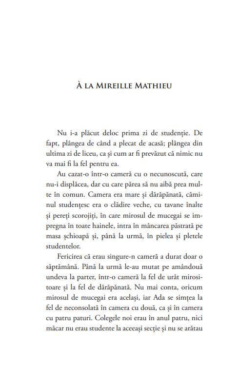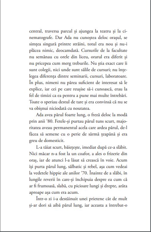Povestitoare înnăscută, pare că nu face niciun efort să scrie; scrisul îi curge asemeni unei cascade, descriind sinuozități discrete, fine, oferindu-i cititorului posibilitatea să facă parte din poveste, să se integreze, să-și amintească propriile trăiri, poate la fel de puternice, dar neexprimate.