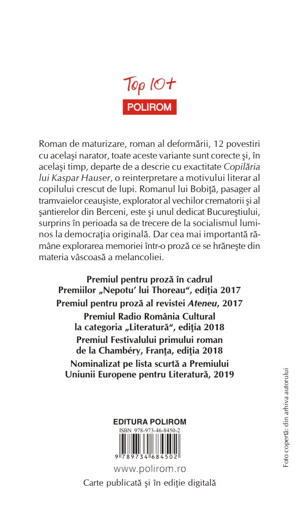 Roman de maturizare, roman al deformării, 12 povestiri cu acelaşi narator, toate aceste variante sunt corecte şi, în acelaşi timp, departe de a descrie cu exactitate Copilăria lui Kaspar Hauser, o reinterpretare a motivului literar al copilului crescut de lupi. Romanul lui Bobiţă, pasager al tramvaielor ceauşiste, explorator al vechilor crematorii şi al şantierelor din Berceni, este şi unul dedicat Bucureştiului, surprins în perioada sa de trecere de la socialismul luminos la democraţia originală. Dar cea mai importantă rămîne explorarea memoriei într-o proză ce se hrăneşte din materia vîscoasă a melancoliei.