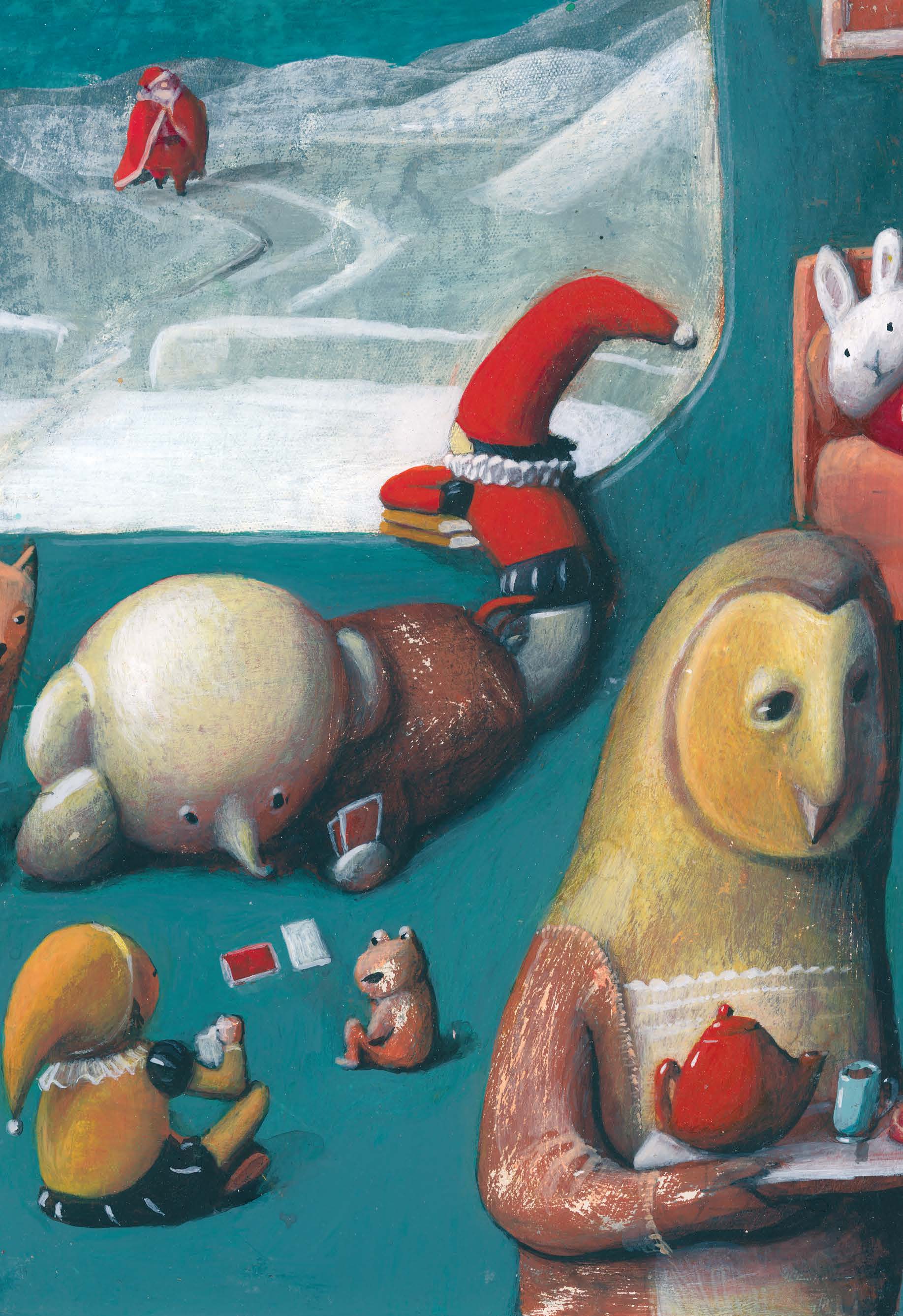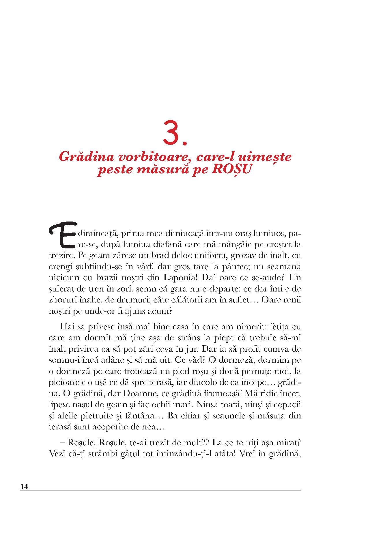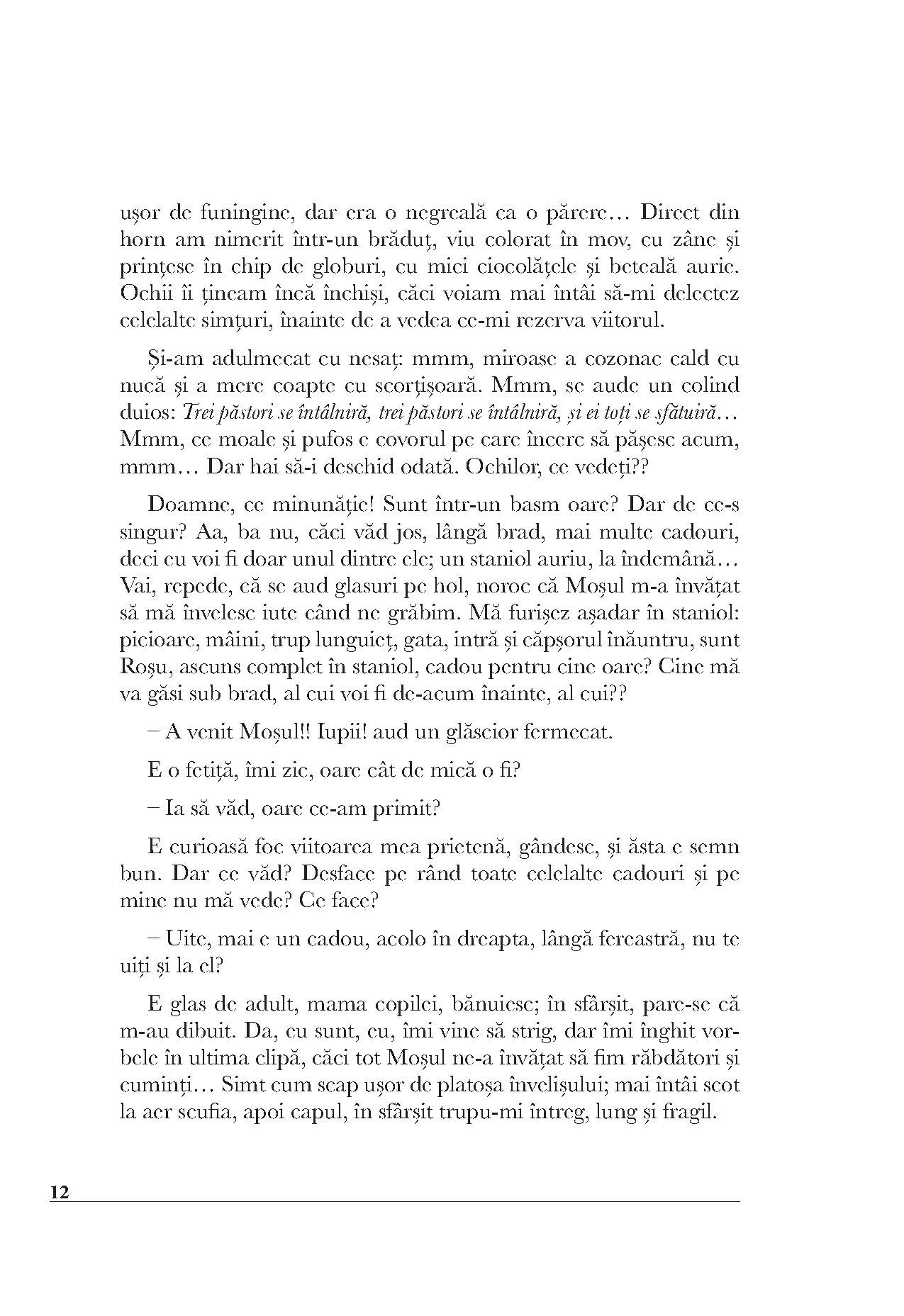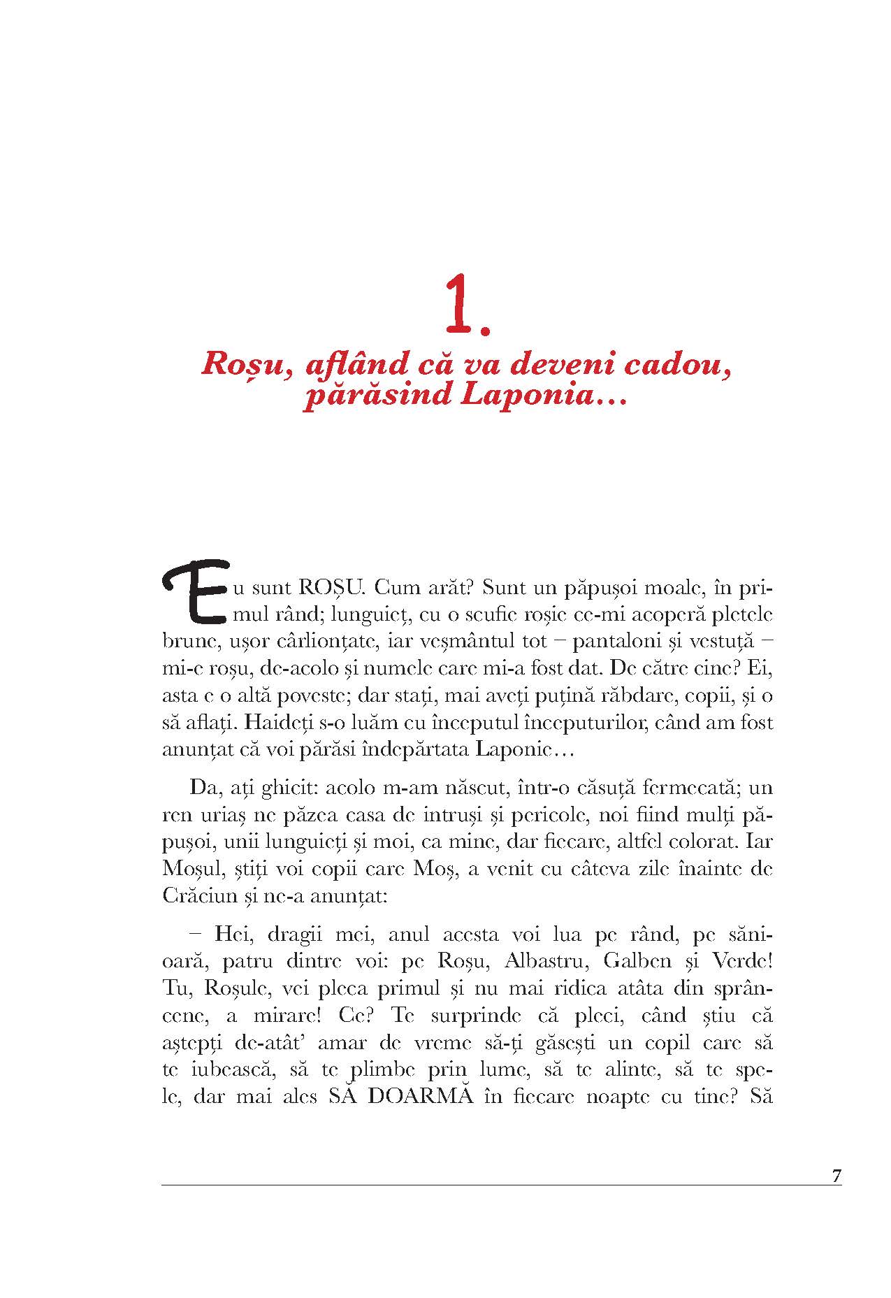 Ajungem bunici, am fost părinți, eram copii... Eram? Eu zic că încă mai suntem aceiași copii ce păstrează în suflet, ca o boare magică, amintirea unei ghidușii, a unei descoperiri nemaiauzite ori a unui păpușoi-prieten de care nici în vis nu ne înduram a ne despărți. Un asemenea păpușoi este și Roșu, personajul cărții noastre. Părăsind Laponia spre a deveni cadoul prețios al fetiței Karina, Roșu uimește încontinuu cititorul. El pare a descoperi curios casa, familia, orașul în care a nimerit și oamenii ce-i ies în cale, și totuși el ascunde atâtea taine... Din lumea din care vine, cunoaște surprinzător de multe lucruri: cântă la orgă, se înțelege în limbi necunoscute cu străinii, știe descântece și secretele bunicii, dar mai ales intuiește perfect trăirile și gândurile fetiței. Luminița Voina-Răuț