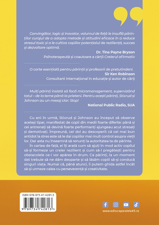Convingător, logic și inovator, volumul de față le insuflă părinților curajul de a adopta metode și atitudini eficace în a reduce stresul toxic și a le cultiva copiilor potențialul de reziliență, succes și dezvoltare optimă.