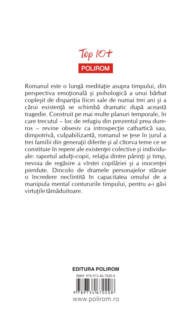 Romanul este o lungă meditaţie asupra timpului, din perspectiva emoţională şi psihologică a unui bărbat copleşit de dispariţia fiicei sale de numai trei ani şi a cărui existenţă se schimbă dramatic după această tragedie. Construit pe mai multe planuri temporale, în care trecutul – loc de refugiu din prezentul prea dureros – revine obsesiv ca introspecţie cathartică sau, dimpotrivă, culpabilizantă, romanul se ţese în jurul a trei familii din generaţii diferite şi al cîtorva teme ce se constituie în repere ale existenţei colective şi individuale: raportul adulţi-copii, relaţia dintre părinţi şi timp, nevoia de regăsire a vîrstei copilăriei şi a inocenţei pierdute. Dincolo de dramele personajelor stăruie o încredere neclintită în capacitatea omului de a manipula mental contururile timpului, pentru a-i găsi virtuţile tămăduitoare.