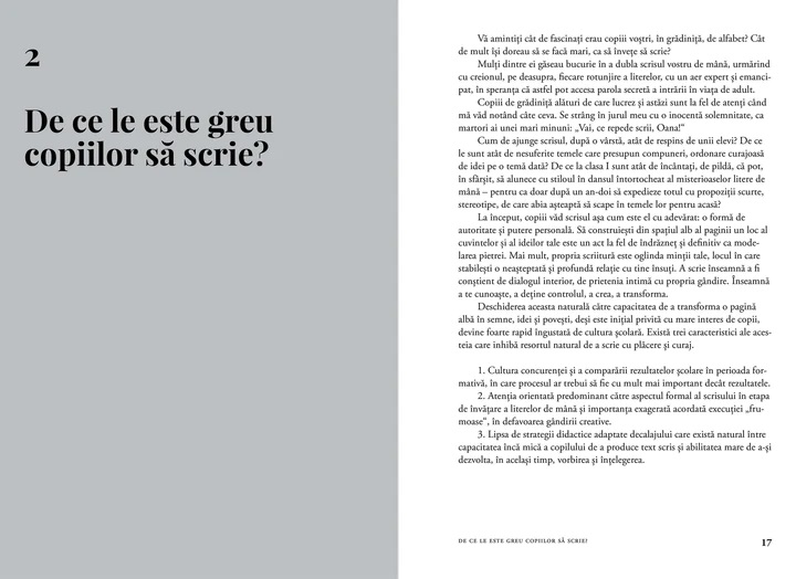 În anii de școală exercițiile de scriere sunt printre cele mai eficiente mecanisme de dezvoltare a gândirii, cu antrenarea etajelor ei, de la recunoaștere și memorare la ordonare, clasificare, analiză, sinteză și creație. Abilitatea copiilor de a scrie text devine o competență fundamentală pentru viitorul lor, într-o lume rapidă, conectată și bazată pe capacitatea oamenilor de a comunica eficient și argumentat. Dar uneori copiii, indiferent de nivelul de inteligență sau de competență în alte arii ale dezvoltării, se confruntă cu dificultăți sau neplăcere în privința scrisului. Cum pot fi sprijiniți acești copii la școală? Ce pot face părinții acasă, încă din primii ani de viață ai copilului lor, pentru a-i dezvolta inteligența emoțională, imaginația și creativitatea, pentru a-i cultiva reziliența și determinarea?