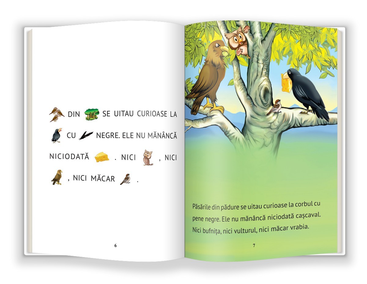 Fiecare fragment este prezentat în două variante: cu majuscule și imagini ajutătoare pentru cei de la grupa mare, dar și cu litere mari și mici de tipar, pentru cei deja în clasa pregătitoare, care leagă literele în cuvânt cu ușurință.
