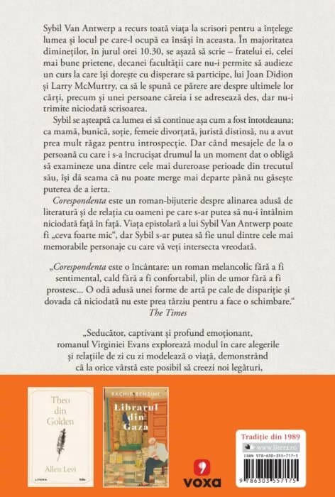 Corespondenta este un roman-bijuterie despre alinarea adusă de literatură și de relația cu oameni pe care s-ar putea să nu-i întâlnim niciodată față în față. Viața epistolară a lui Sybil Van Antwerp poate fi „ceva foarte mic“, dar Sybil s-ar putea să fie unul dintre cele mai memorabile personaje cu care vă veți intersecta vreodată.