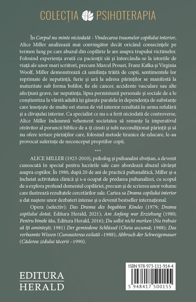 In Corpul nu minte niciodata ( noua editie a volumului - Revolta corpului) Alice Miller analizeaza mai convingator decat oricand consecintele pe termen lung pe care abuzul din copilarie le are asupra trupului victimelor. Folosind experienta avuta cu pacientii sai si intorcandu-se la istoriile de viata ale unor mari scriitori, precum Marcel Proust, Franz Kafka si Virginia Woolf, Miller demonstreaza ca umilinta traita de copii, sentimentele lor reprimate de neputinta, furie si ura la adresa parintilor se manifesta la maturitate sub forma bolilor, fie ele cancer, accidente vasculare sau alte afectiuni grave, iar neputinta, lipsa permisiunii personale si sociale de a le constientiza la varsta adulta isi gaseste paralela in dependenta de substante care insoteste de multe ori starea de vid interior rezultata in urma refularii si a clivajului interior. Ca specialist ce nu s-a ferit niciodata de controverse, Alice Miller indeamna vehement societatea sa renunte la imperativul otravitor al poruncii biblice de a-ti cinsti si iubi neconditionat parintii si sa nu ofere iertare parintilor care, folosind metode tiranice de educare, au provocat suferinte de neconceput copiilor proprii.