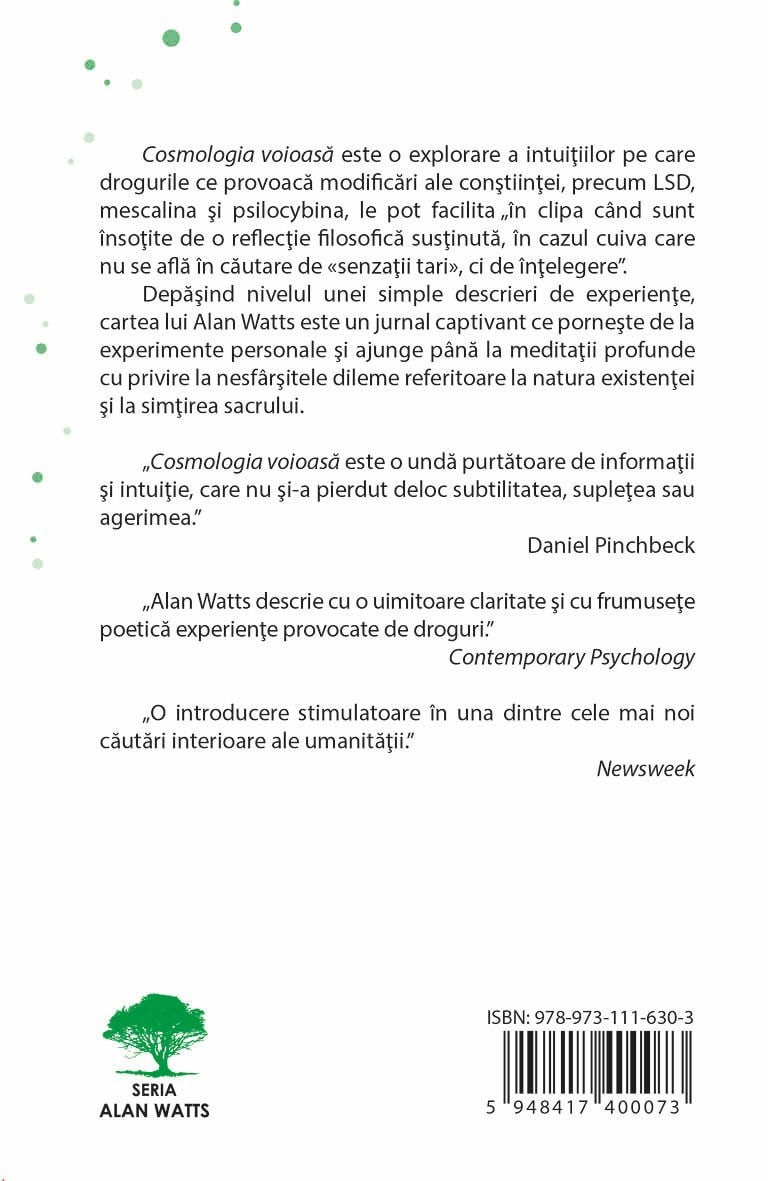 Cosmologia voioasa este o explorare a intuitiilor pe care drogurile ce provoaca modificari ale constiintei, precum LSD, mescalina si psilocybina, le pot facilita „in clipa cand sunt insotite de o reflectie filosofica sustinuta, in cazul cuiva care nu se afla in cautare de «senzatii tari», ci de intelegere”.