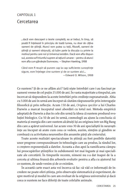 „Acum 150 de ani, Originea speciilor a lui Charles Darwin a marcat începutul unei abordări cu totul noi. Metoda empirică adoptată de Darwin a dus în cele din urmă la ideea că suntem produsul evoluției biologice. Cu 50 de ani în urmă, cosmologii au ajuns la concluzia că materia și energia din care suntem alcătuiți își au originea într-un Big Bang din care a apărut universul. Iar acum vreo 30 de ani specialiștii în neuroștiințe au început să arate cum ceea ce vedem, auzim, simțim și gândim se corelează cu activitatea neuronilor din anumite părți ale creierului. [...] În această carte voi încerca să văd ce informații de încredere ne poate oferi știința, prin observație sistematică și experiment, despre modul în care am evoluat de la originea universului și dacă ceea ce suntem ne face diferiți de toate celelalte animale.“ – JOHN HANDS